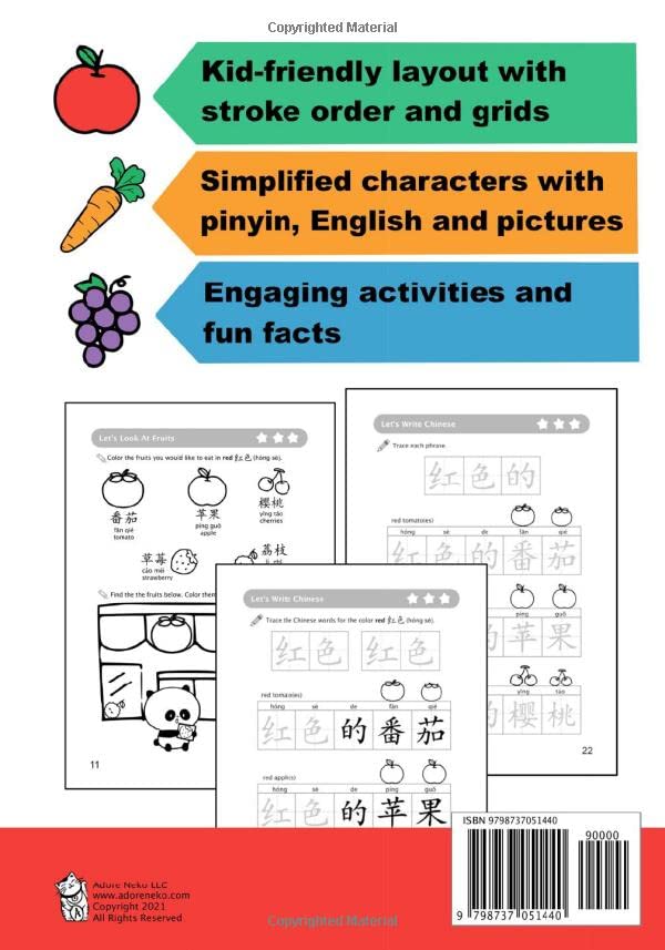 Write Mandarin Chinese words about colors and how to use them to describe healthy fruits and vegetables with simplified Chinese characters, English translations and pinyin. Get your child excited about the Chinese language with this fun Chinese character writing, coloring and activity workbook. Build your child’s confidence in writing simplified Chinese characters with easy to follow stroke order diagrams and “I can” checklist. Written to help educators, parents and children learn Chinese together. Great for beginner Chinese self study, homeschool and Mandarin immersion programs. Introduce your child to basic Chinese words, phrases and culture with engaging activities and fun facts. Here are some of the Mandarin Chinese activities in this bilingual English Chinese writing book for children: Write & trace Chinese characters with numbered strokes and large grids. Search and find fruits & vegetables for Chinese characters. Color fruits and vegetables popular in Chinese culture. Travel through a carrot maze to learn Chinese words. Learn about the panda’s hidden secret power.