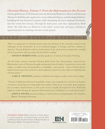 Thomas S. Kidd presents a global history of the Christian church in the modern age. Christian History, Volume 2: From the Reformation to the Present provides a composite picture of important, influential, and representative Christian beliefs, thinkers, activists, trends, and practices from about 1500 to the present day. In a highly readable style, Kidd covers the events and figures from the Reformation, the Great Awakenings, higher criticism, and the culture wars of the late twentieth and early twenty-first centuries. This volume also covers the global nature of God’s church by examining historical global traditions as well as the recent the demographic shift of active Christian communities to the global South. In addition to the major theologians, movements, and events of the period, Kidd highlights the everyday Christian experience through the centuries, including accounts of ordinary men and women who experienced conversion, lived sacrificially for the gospel, or endured persecution. A lively, engaging, and readable text, Christian History, Volume 2: From the Reformation to the Present will become a staple text for students and professors alike.