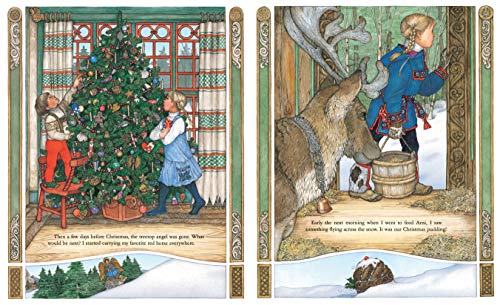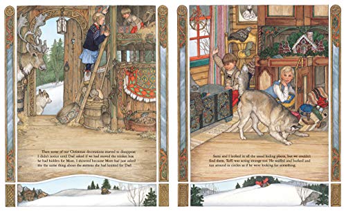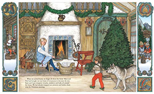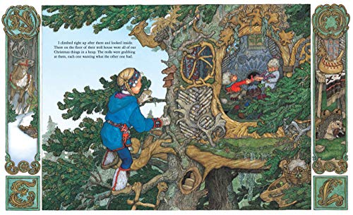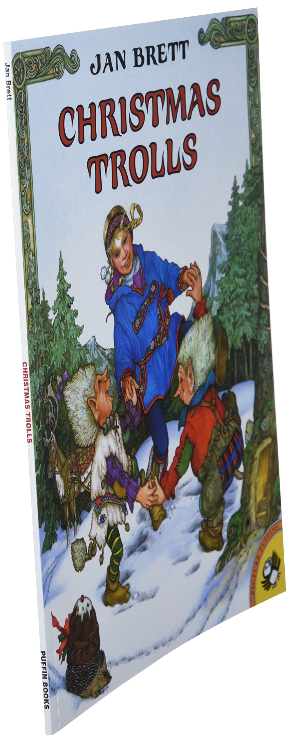Christmas is Treva’s favorite time of year, especially the preparations — finding the perfect tree, decorating the house, and making presents for her family. But this year is different. Small things are disappearing, then some of the presents themselves. Treva is mystified, until early one morning she sees a small creature scurrying across the snow, carrying the Christmas pudding. Treva races after it into the forest where her adventures are just beginning. . . Christmas Trolls is a glorious celebration of the season as Treva confronts two irresistible trolls who don’t understand Christmas. Jan Brett’s exquisite paintings set against beautiful, intricate borders give readers a magical Christmas full of surprises. (Look closely at the borders for glimpses of the trolls’ special little helper — and he’s not an elf!)