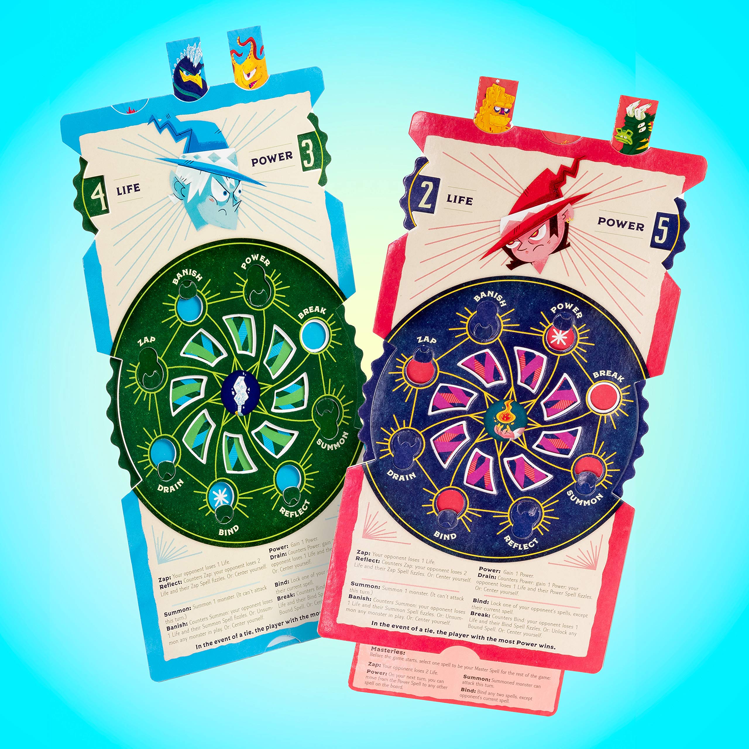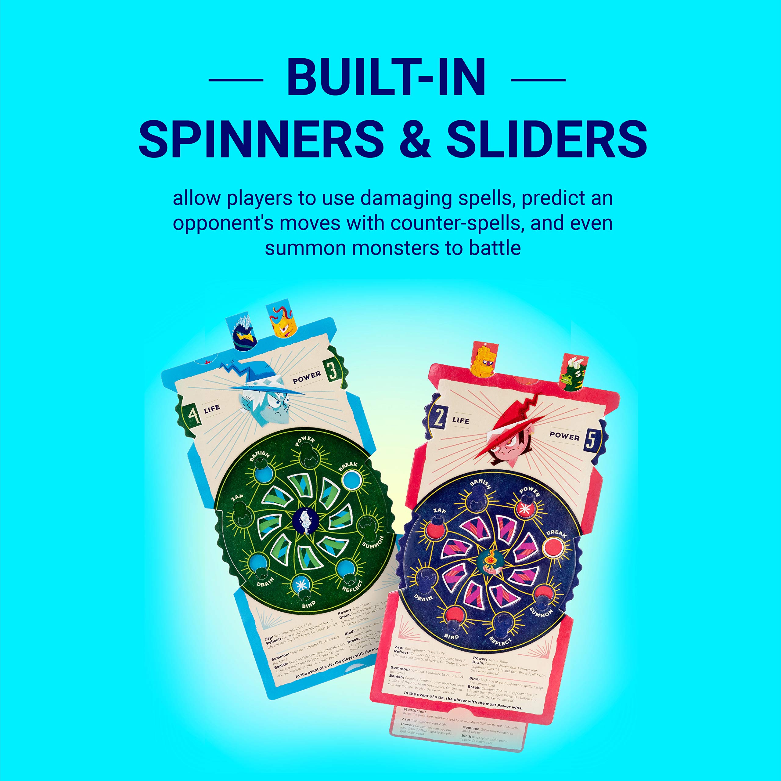 - Fully contained game cards: in this fast-paced and magical game for two, players use Fully contained game cards with built-in spinners and tabs. Includes two game cards.
