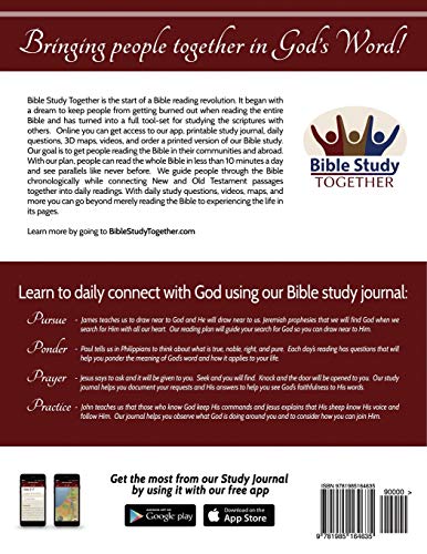 IMPORTANT NOTE: This book is the first volume in a four-volume series.Bible Study Together is the start of a Bible reading revolution. It began with a dream to keep individuals from getting burned out when reading the entire Bible and has turned into a full tool-set for studying the scriptures with others in small groups or as a whole church. Our Bible Study Journal pulls together some of our resources in one book to help you develop a consistent quiet time with God and then share what you have learned with others.The Chronological Cross-Reference Bible Study Journal takes you through the whole Bible in two years with less than 10 minutes of reading each day and empowers you to see parallels in the scriptures like never before. We will guide you through the Bible chronologically while connecting New and Old Testament passages together into daily readings. Each day has open-ended questions about the reading to help you ponder what God is speaking to you. This unique reading experience uses the Bible to explain itself and helps you understand how the New Testament fulfills the Old Testament.This study journal is our guide to help you connect with God each day so that you can get charged to go out into the world and live the life you have been called to in Jesus. We have harnessed what many believers have learned over centuries and compiled it into our journal. This can be summarized in four words: Pursuit, Pondering, Prayer, and Practice. Each day our journal will guide you to God’s throne of grace where you can receive the wisdom and strength that produces the reflection of God’s nature in you.Though our Bible study journal is a great tool by itself, it is even better when combined with our free mobile app or online tools. Here you can conveniently use our reading plan without having to flip pages to the various passages and get access to our 3D maps, videos, and much more. With daily study questions, videos, and maps combined with our powerful reading plan you can go beyond merely reading the Bible to experiencing the life in its pages.Learn more by going to BibleStudyTogether.com