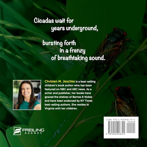 “BEST-SELLER, FEATURED ON ABC, CBS, FOX, and NBC NEWS!” Welcome to the enchanting world of “Cicadas Don’t Bug Me!” In this delightful rhyming adventure, children are invited to embark on a journey filled with vibrant photographs and captivating cicada facts. Join best-selling children’s book author Christen M. Jeschke as you discover the fascinating life cycle of these amazing creatures and learn to embrace the wonder of nature. As emerging cicadas make their grand appearance, children are encouraged to marvel at their remarkable transformations instead of fearing them. Through the pages of this engaging book, young readers will not only develop an appreciation for the beauty of cicadas but also cultivate a sense of curiosity and awe for the world around them. “Cicadas Don’t Bug Me” is more than just a book-it’s a gentle reminder to approach nature with wonder, not worry. So come along and dive into this fact-filled, charming book where cicadas reign supreme and curiosity knows no bounds. Let’s embark on an unforgettable bug-learning adventure together!