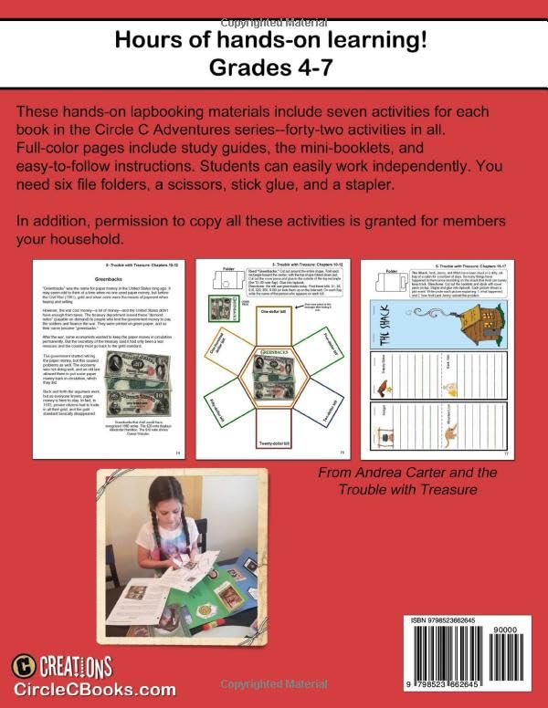 This perfect-bound workbook of lapbooking activities is 93 single-sided pages (blank pages on the backsides to allow for cutting out the booklets). It includes the study guides and full-color booklets to cut out and create forty-two hands-on activities. Just tear out the pages. Also includes an answer key and easy-to-follow instructions. Students can work independently. All you need are six file folders, a scissors, glue, and a stapler to create a fun hands-on learning experience to accompany the Circle C Adventures six-book historical adventures series. Grades 4-7