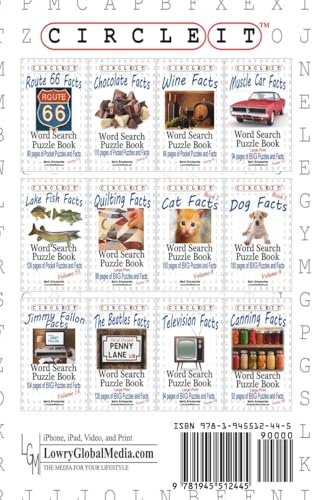 Do you love Route 66, then your just found the right book!!! You already really like word searches, but most books are virtually the same with just lists of words. There must be something more, and now there is; in our books you can read interesting facts, the bold words within the text can be found in the puzzle on the opposite page. No more boring lists of words(TM). This book contains interesting facts about Route 66. It reads like a book and it also has page after page of word search puzzles. Why just work through lists of words when you can discover interesting facts about Route 66 and enjoy some stimulating Circle It word search. No more boring lists of words(TM). The words for the Circle It word search are in bold within the text. All of the Facts series of Circle It word search books contain a wide variety of community contributed information that is useful, interesting, and fun. Get yours today. Each “Circle It” word search book has an interesting subject, like: * Dog Facts * Cat Facts * Lake Fish Facts * World War II Facts * Jimmy Fallon Facts * Chocolate Facts * …many many more (100+ titles) Lowry Global Media, Circle It Word Search Books are all available from your favorite online bookseller. Just search for “Lowry Global Media” to see all of our word search titles. Looking for a gift? Our books are great for anyone ages 12 to 99.