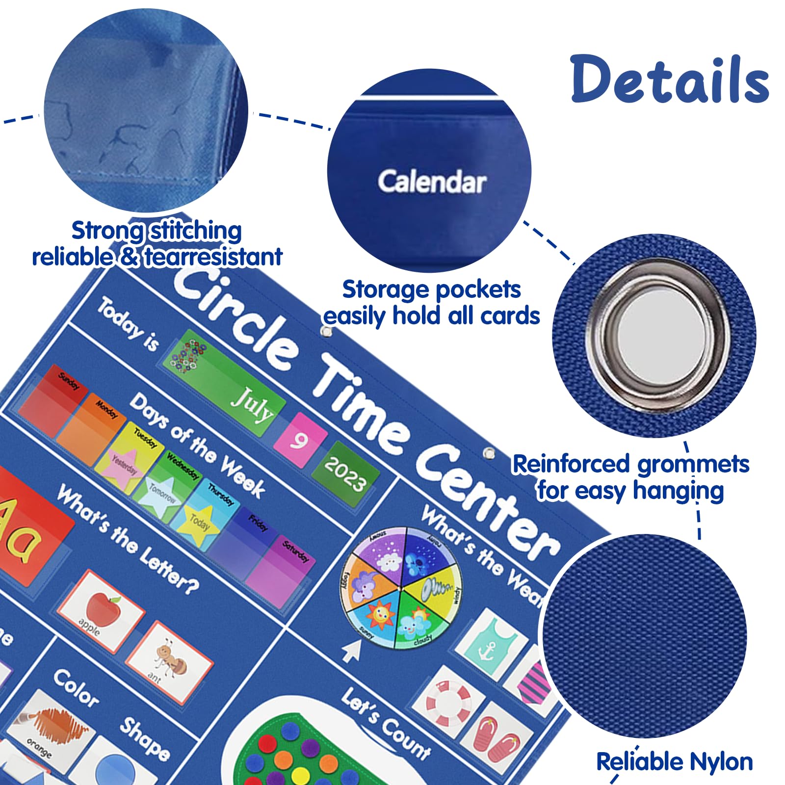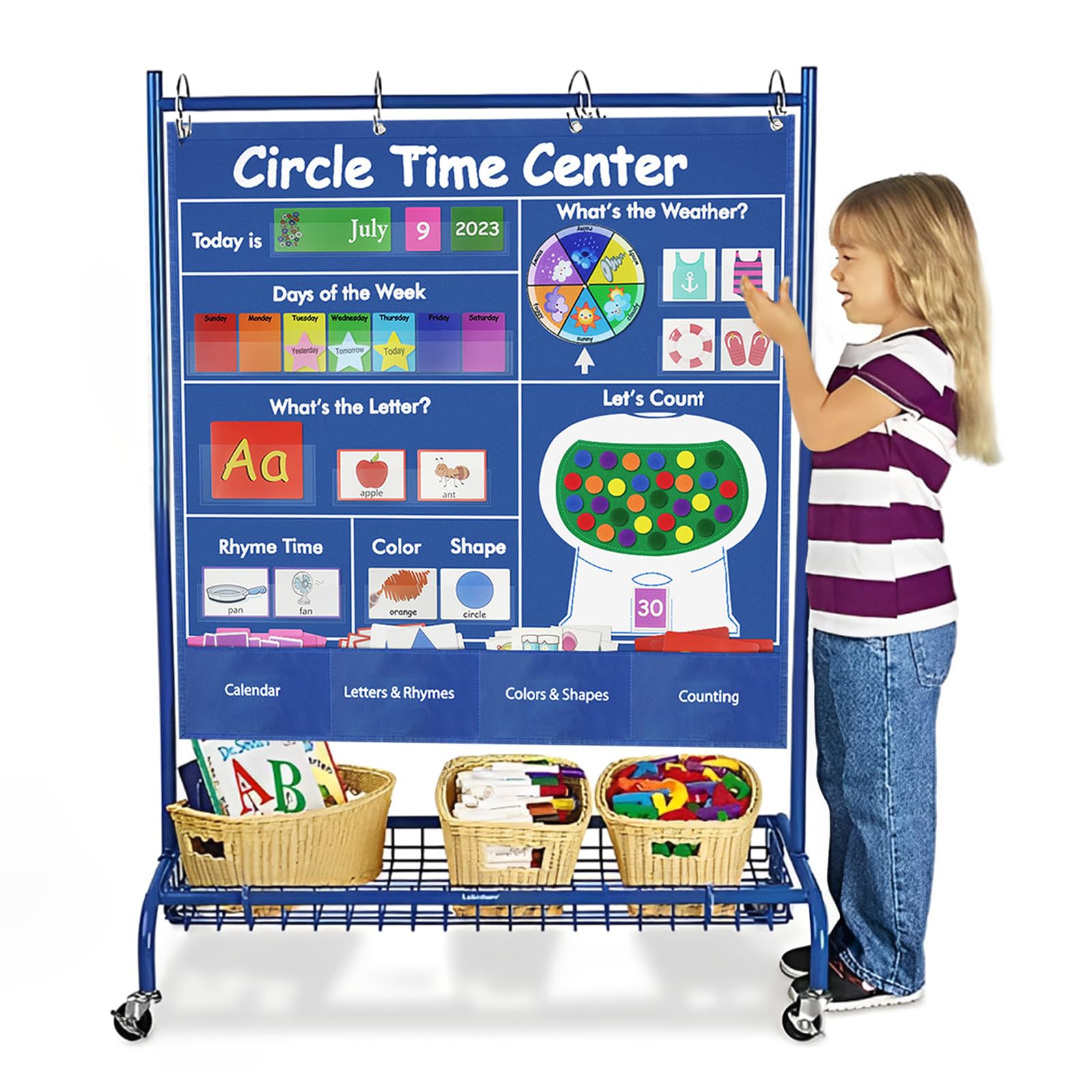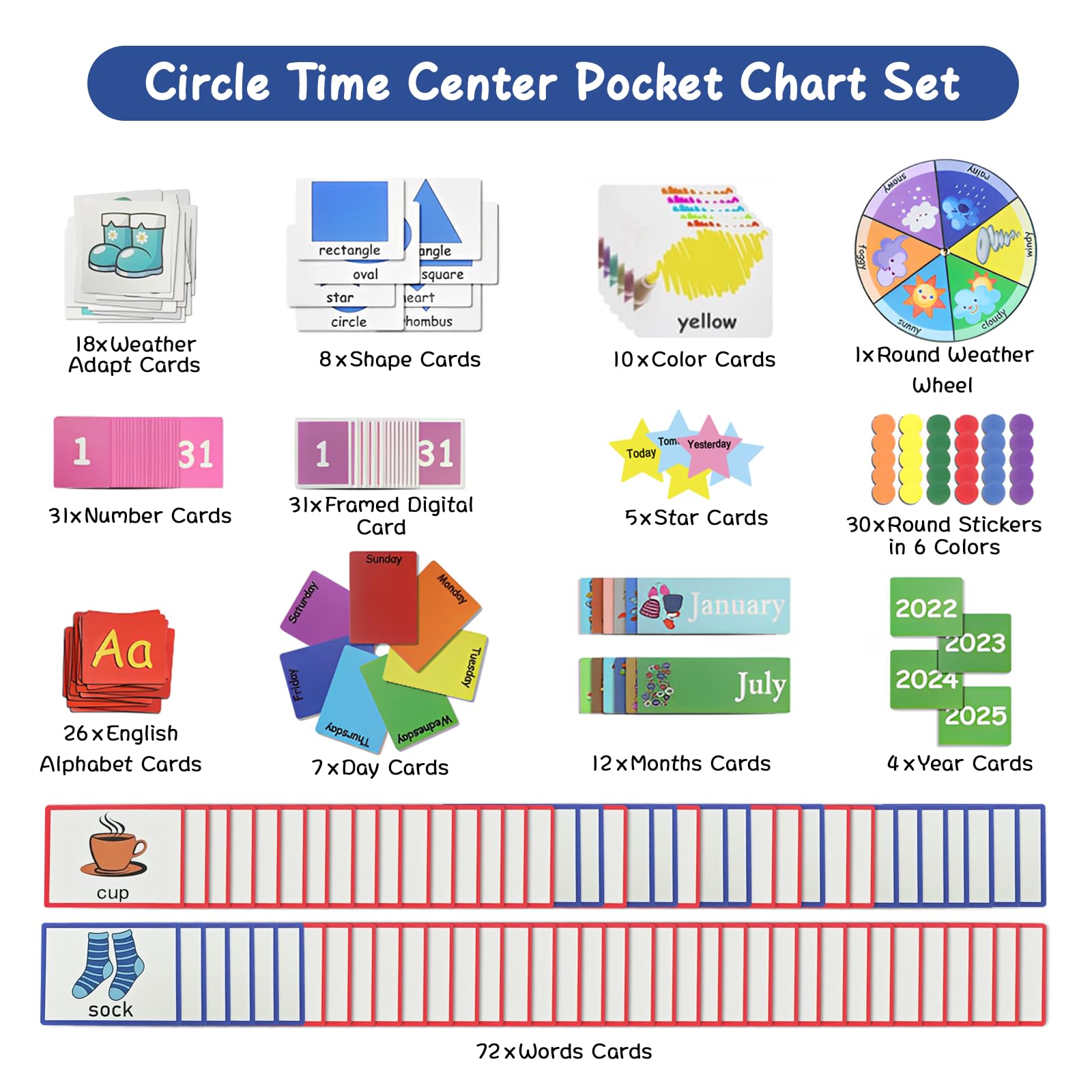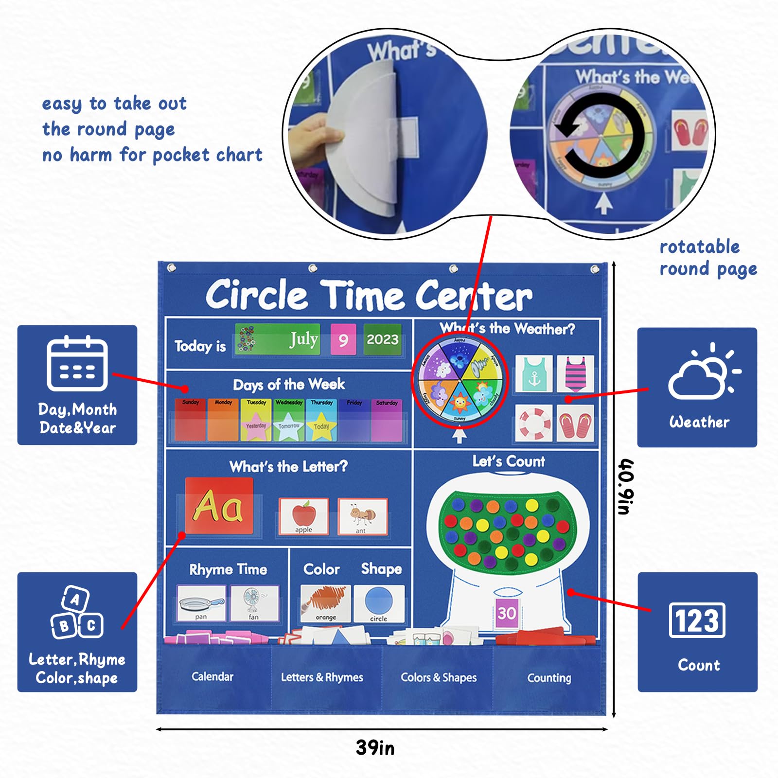 - Circle Time Learning Center Set:The toy has 217 cards, 30 round stickers in 6 colors, 1 large round weather wheel- All functions in one center are designed for circle time, from calendar cards, interesting picture cards that teach and strengthen the days and months, explore rhyming words, colors, shapes and more.