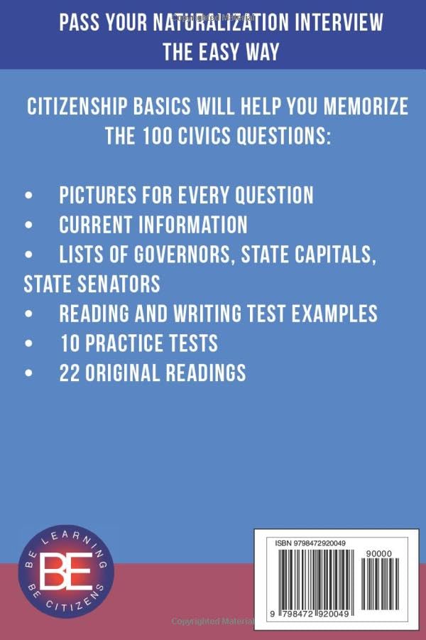 USCIS Aligned Naturalization Interview 100 Civics Questions Current for 2025 Easy “Pictures for Every Question” Format 22 Original Readings 10 Practice Tests Current Senators, Governors, and State Capitals English as a second language learner friendly Written by Experienced, Credentialed ESL Citizenship Instructors Best Quality Study Guide for the Money Presidential Election Results are in, Don’t delay your N-400 application Updated for 2025! If you only need to study for the 100 Civics Questions for the United States Citizenship and Naturalization Interview, then CITIZENSHIP BASICS U.S. Citizenship Test Study Guide is the best choice. The 100 civics questions are presented in original historical readings and as questions and answers with rich, relevant pictures. Included are reading and writing vocabulary practice, state capitals, states’ senators, state governors and 10 practice tests. This book has 22 History and Government readings, each one read by a famous American. The 100 questions with current information and pictures. A Current list of the 50 governors. A Current list of the 100 senators. All 50 of the states’ capitals. Official Reading vocabulary and practice sentences. Official Writing vocabulary and practice sentences. 10 practice tests. Quotes from 3 famous immigrants who became U.S. Citizens. Pass your United States Naturalization Interview with Citizenship Basics. Pasa tu entrevista con el mejor libro de ciudadania. This textbook complies with: The Citizenship and Integration Grant Program Citizenship Instruction and Naturalization Application Services (CINAS) Community and Regional Integration Network Grant (CARING Innovations in Citizenship Preparation Program Citizenship Integration Training Academy (CITA) Apply and prepare now before the test is redesigned!
