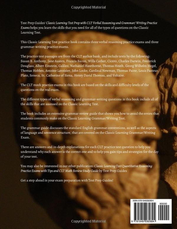 Test Prep Guides’ Classic Learning Test Prep with CLT Verbal Reasoning and Grammar/ Writing Practice Exams helps you learn the skills that you need for all of the types of questions on the Classic Learning Test. This Classic Learning Test practice book contains three verbal reasoning practice exams and three grammar-writing practice exams. The practice test passages are from the classical literature and historical texts in the CLT author bank, and include texts by the following: Susan B. Anthony Jane Austen Francis Bacon Willa Cather Cicero Charles Darwin Frederick Douglass Albert Einstein Galileo Nathaniel Hawthorne Thomas Heath Georg Wilhelm Hegel Thomas Hobbes Antoine Lavoisier John Locke Cardinal Newman Thomas Paine Louis Pasteur Plato Seneca St. Catherine of Siena Henry David Thoreau Voltaire The CLT mock practice exams in this book are based on the skills and difficulty levels of the questions on the real exam. The different types of verbal reasoning and grammar-writing questions in this book include all of the skills that are assessed on the Classic Learning Test. The book includes an extensive grammar review guide that shows you how to avoid the errors that students commonly make on the Classic Learning Grammar/Writing Test. The grammar guide discusses the standard English grammar conventions, as well as the aspects of language and sentence structure, that are covered on the Classic Learning Grammar/Writing Exam. There are answers and in-depth explanations for each CLT practice test question to help you understand why each answer is the correct one and to help you gain tips and strategies for the day of your test. Are you taking the CLT Quantitative Reasoning Exam? You may also be interested in our other publication: Classic Learning Test Quantitative Reasoning Practice Exams with Tips and CLT Math Review Study Guide by Test Prep Guides Improve your critical thinking to get a step ahead in your exam preparation with Test Prep Guides! Note: The Classic Learning Test and CLT Exam are registered trademarks of Classic Learning Initiatives, LLC, which is neither affiliated with nor endorses this publication.