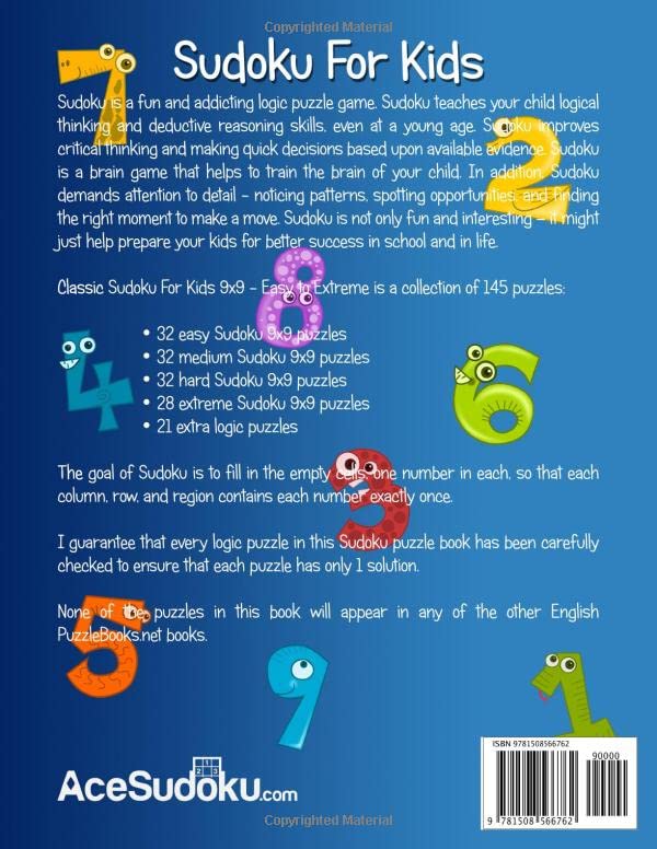 Sudoku is a fun and addicting logic puzzle game. Sudoku teaches your child logical thinking and deductive reasoning skills, even at a young age. Sudoku improves critical thinking and making quick decisions based upon available evidence. Sudoku is a brain game that helps to train the brain of your child. In addition, Sudoku demands attention to detail – noticing patterns, spotting opportunities, and finding the right moment to make a move. Sudoku is not only fun and interesting – it might just help prepare your kids for better success in school and in life. Classic Sudoku For Kids 9×9 – Easy to Extreme is a collection of 145 puzzles: 32 easy Sudoku 9×9 puzzles 32 medium Sudoku 9×9 puzzles 32 hard Sudoku 9×9 puzzles 28 extreme Sudoku 9×9 puzzles 21 extra logic puzzles The goal of Sudoku is to fill in the empty cells, one number in each, so that each column, row, and region contains each number exactly once. I guarantee that every logic puzzle in this Sudoku puzzle book has been carefully checked to ensure that each puzzle has only 1 solution. None of the puzzles in this book will appear in any of the other English PuzzleBooks.net books. Sudoku is also known as Number Place, Nanpure, Su Doku. Quite often Sudoku is misspelled as Suduko, Soduko, Sodoku, Sudoko, Suduku or Soduku.