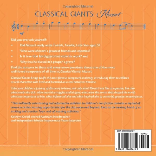 Did you ever ask yourself: Did Mozart really write Twinkle, Twinkle, Little Star aged 5? Who were Mozart’s greatest friends and enemies? Is it true that his biggest rival stole his work? and Why was he buried in a pauper’s grave? Find the answers to these and many more questions about one of the most well-loved musicians of all time in, Classical Giants: Mozart. Classical Giants brings to life the most famous composers in history, introducing them to children as real characters who lived and breathed on a real historical timeline. Take your child on a journey of discovery to learn, not only what Mozart was like as a person, but also what made him tick: what were his struggles and his joys; what were the events that shaped his world; what was important to him, what influenced him and what inspired him to create his greatest masterpieces. “This brilliantly entertaining and informative addition to children’s non-fiction contains a myriad of cross-curricular learning opportunities for the classroom and beyond. English, Music, History, Art, Maths and Science can be taught through this book making it ideal as the beating heart of an exciting and creative Topic web of learning activities. Useful for assemblies too and Social and Emotional learning, adults will enjoy it just as much as children.” Kathryn Creed, retired Assistant Headteacher and Independent Schools Inspectorate Team Inspector. For further information on the series, please visit www.classicalgiants.com