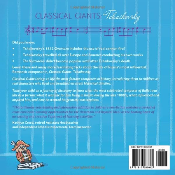 Did you know that: Tchaikovsky’s 1812 Overture famously includes the use of real cannon fire Tchaikovsky’s ballet “Swan Lake” in 1877 was initially met with mixed reviews Tchaikovsky was an accomplished conductor and travelled extensively to conduct his own works “The Nutcracker” did not gain widespread popularity until after Tchaikovsky’s death Find out about these and many more fascinating events that shaped the life of one of Russia’s most influential Romantic composers in, Classical Giants: Tchaikovsky. Classical Giants brings to life the most famous composers in history, introducing them to children as real characters who lived and breathed on a real historical timeline. Take your child on a journey of discovery to learn what the most celebrated composer of Ballet was like as a person, why his life was so dogged with worry; what it was like for him living in Russia during the late 1800’s; what was important to him, what influenced him and what inspired him to create his greatest masterpieces. “This brilliantly entertaining and informative addition to children’s non-fiction contains a myriad of cross-curricular learning opportunities for the classroom and beyond. English, Music, History, Art, Maths and Science can be taught through this book making it ideal as the beating heart of an exciting and creative Topic web of learning activities. Useful for assemblies too and Social and Emotional learning, adults will enjoy it just as much as children.” Kathryn Creed, retired Assistant Headteacher and Independent Schools Inspectorate Team Inspector. For more information on the series visit www.classicalgiants.com