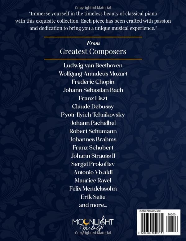 Your First Steps into the World of Classical Piano Music! Your search for a reliable and complete classical piano resource ends here. Classical Piano Sheet Music – Famous and Favorite Masterpieces is your one-stop solution for learning and enjoying piano classics. With over 70 carefully selected compositions from the masters – Beethoven, Bach, Chopin, Debussy, and Pachelbel among them. Designed with beginner pianists in mind, this book ensures a smooth and enjoyable learning experience while providing just the right touch of challenge to keep you inspired. With its elegant layout and thoughtfully arranged pieces, you’ll find yourself progressing with confidence and ease. Let these timeless masterpieces fuel your passion for piano and immerse you in the joy of music without frustration. Why You’ll Love This Book This is a “Must Have” Piano Book: Essential for every beginner pianist, this book offers a comprehensive introduction to classical music that will enrich your playing experience and ignite your passion for the piano – all in one place! A Great Mix of Classical Pieces: With a variety of classic compositions ranging from simple to slightly more challenging, this book provides a perfect blend of music that caters to the needs of beginners. Famous and Well-Known Compositions: Play iconic pieces by legendary composers such as Johann Sebastian Bach, Ludwig van Beethoven, Wolfgang Amadeus Mozart, Frederic Chopin – and more, all thoughtfully selected to inspire and delight you. Tailor-Made for Beginners: Each piece is carefully simplified to suit the skill level of beginners, ensuring that you can enjoy playing without feeling overwhelmed by complexity. High-Quality Notation: Enjoy clear and easy-to-read sheet music that makes practice sessions more effective and enjoyable. Ideal for All Ages: Whether you are a young student just starting out or an adult rekindling a passion for piano, this book is suitable for learners of all ages. In this book, you’ll discover over 70 beautiful classical compositions curated from the repertoires of more than 30 renowned composers. Here are some of the famous pieces featured: Johann Sebastian Bach Air on the G String Minuet in G major Prelude No. 1 in C Major / “The Well-Tempered Clavier” Ludwig van Beethoven Fur Elise Ode to Joy Sonata No. 14 / “Moonlight Sonata” Johannes Brahms Lullaby / “Cradle Song” Frederic Chopin Nocturne in E-flat major Prelude in A major Claude Debussy Clair de Lune George Frideric Handel Joy to the World Franz Liszt Liebestraume / “Love Dream” Wolfgang Amadeus Mozart Eine Kleine Nachtmusik Minuet in F major Sonata No. 11 in A major / “Rondo Alla Turca” Johann Pachelbel Canon in D Franz Schubert Ave Maria Robert Schumann Stuckchen Traumerei Johann Strauss II The Blue Danube Pyotr Ilyich Tchaikovsky Swan Lake “Don’t miss out on adding this piano sheet music book to your favorite collection!”