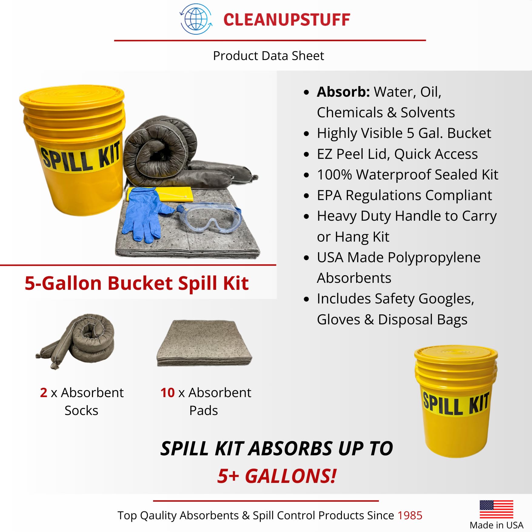 CleanUp Stuff Original Bucket Spill Kit – Universal Absorbents & 5-Gallon Yellow Bucket – Spill Pads & Absorbent Socks for Water, Oil Spill Clean Up and More – Absorb 5 Gallons of Fluid (Made in USA)