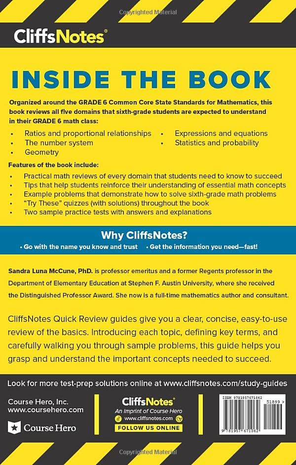 Get the information you need–fast! CliffsNotes Quick Review course guides cover the essentials of your toughest classes. Get a firm grip on core concepts and key material, and test your newfound knowledge with review questions. Introducing each topic, defining key terms, and carefully walking you through each sample problem, these guides help you grasp and understand the important concepts needed to succeed. The essentials — FAST — from the experts at CliffsNotes Complete coverage of core concepts Easy topic-by-topic organization Access hundreds of practice problems at www.cliffsnotes.com Nearly half of adults, including parents of middle-school students, have never heard of the Common Core State Standards, let alone have a working knowledge of what exactly their children face when it comes to middle-school math. Even teachers acknowledge struggling with how best to teach their students these math standards. CliffsNotes comes to the rescue with this Grade 6 Common Core Math Review. Aligned to the state standards, this book provides essential coverage of the Grade 6 CCSS math that’s challenging middle-school students, teachers, and parents alike. In no time, you’ll be ready to tackle the key concepts, such as: Ratios and proportional relationships The number system Geometry Expressions and equations Statistics and probability Two practice tests round out the book, plus every review chapter includes example problems. With Review Questions, a Resource Center, and a Glossary. Why CliffsNotes? In plain words and useful formats, CliffsNotes 6th Grade Common Core Math: Quick Review provides an overview of the math standards that comprise Grade 6 CCSS math, so that you can use your study time efficiently. Use this reference in any way that fits your personal style for study and review–you decide what works best with your needs. Or, here are just a few other ways you can search for topics: Use the free Pocket Guide full of essential information Get a glimpse of what you’ll gain from a chapter by reading through the Chapter Check-In at the beginning of each chapter Use the Chapter Checkout at the end of each chapter to gauge your grasp of the important information you need to know Test your knowledge more completely in the CQR Review and look for additional sources of information in the CQR Resource Center Use the glossary to find key terms fast With titles available for all the most popular high school and college courses, CliffsNotes Quick Review guides are a comprehensive resource that can help you get the best possible grades. Access 500 additional practice questions at www.cliffsnotes.com. From CliffsNotes, the makers of the study guides you trust, year after year!