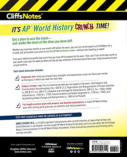 A last-minute cram plan for the AP World History exam! This new edition of CliffsNotes AP World History Cram Plan calendarizes a study plan for the 265,000 AP World History test-takers depending on how much time they have left before they take the May exam. Features of this plan-to-ace-the-exam product include: * 2-months study calendar and 1-month study calendar * Diagnostic exam that helps test-takers pinpoint strengths and weaknesses * Subject reviews that include test tips and chapter-end quizzes * Full-length model practice exam with answers and explanations