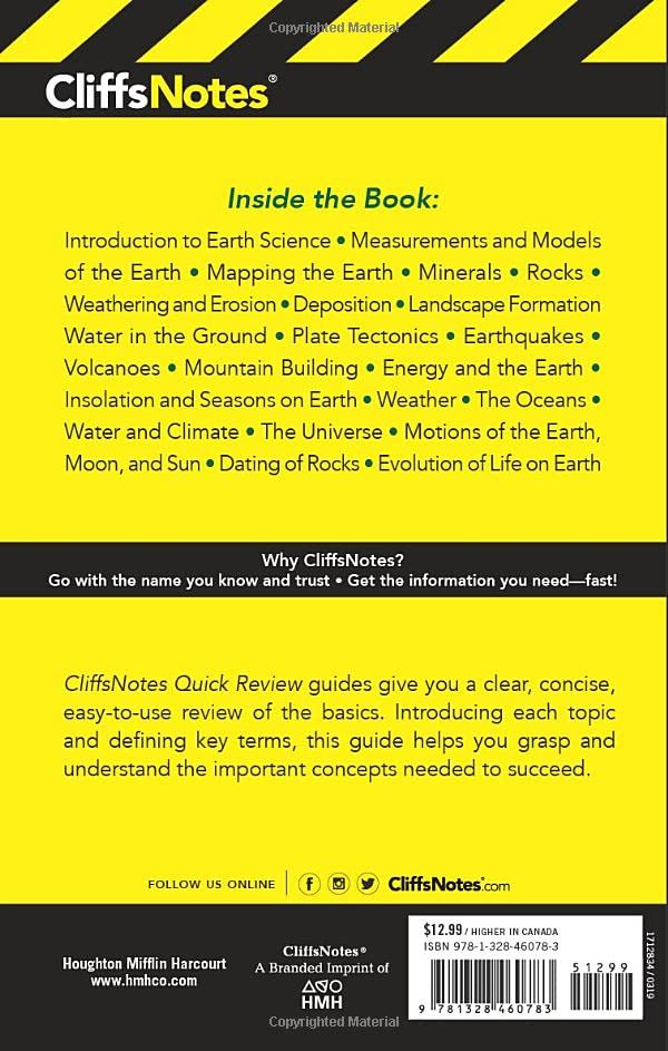 A quick-in, quick-out Earth Science study guide that includes subject review chapters and practice questions throughout CliffsNotes Earth Science Quick Review, 2nd Edition, provides a clear, concise, easy-to-use review of earth science basics. Perfect for middle school and high school students, as well as for anyone wanting to brush up on their knowledge of how the earth’s systems function.Whether you’re new to minerals and rocks, or motions of the earth, moon, and sun, or just wanting to refresh your understanding of the subject, this guide can help. Aligned to NGSS, it includes topics such as plate tectonics and mountain formation, weathering and erosion, and measurements and models of the earth. Approximately 49% of the nation’s 8th graders take an earth science course, and slightly over 17% of high school students take the course before graduating.