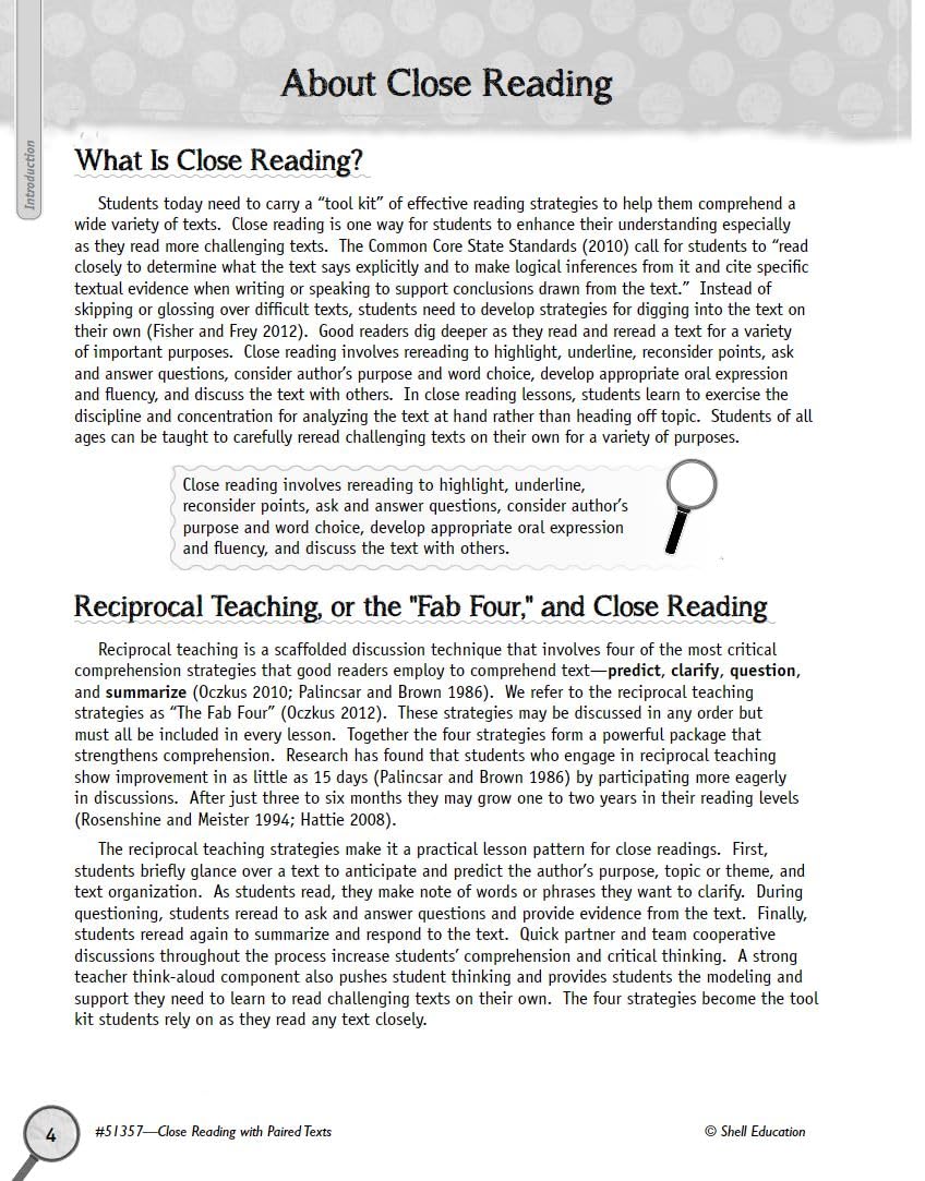 Teach first grade students close reading strategies that strengthen their fluency and comprehension skills! Students will read and analyze various types of texts to get the most out of the rich content. Their reading skills will improve as they answer text-dependent questions, compare and contrast texts, and learn to use close reading strategies on their own! The lessons are designed to make close reading strategies accessible, interactive, grade appropriate, and fun. The lesson plans are easy to follow, and offer a practical model built on research-based comprehension and fluency strategies.