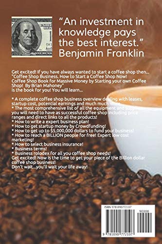 How to get startup MONEY!, Wholesale Supplies & Equipment!, Write a expert Business Plan! Coffee Shop Business. How to Start a Coffee Shop Now! Coffee Shop Book for Massive Money by Starting your own Coffee Shop! By Brian Mahoney Get excited! If you have always wanted to start a coffee shop then… this is the book for you! You will discover… * A complete coffee shop business overview dealing with leases, startup cost, potential earnings and much much more. * The most comprehensive list of all the equipment and supplies you will need to have a successful coffee shop including price ranges and direct links to all the products! * How to write a expert business plan! * How to get startup money by Crowdfunding! * How to get up to $5,000,000 dollars to fund your business! * How to reach a BILLION people for free! Expert low cost marketing! * How to select business insurance! * Business terms! * Business Rolodex for all you coffee shop needs! Get excited! Now is the time to get your piece of the Billion dollar coffee shop business! Don’t wait…you’ll wait your life away!