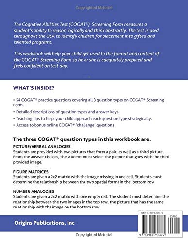 This book contains a Grade 2 CogAT(r) Screening Form practice test, which provides gifted and talented CogAT test preparation for third grade students. By buying this book, you will also get access to BONUS CogAT “challenge” questions online! This Level 8 (Grade 2) practice test will prepare your child for the Cognitive Abilities Test (CogAT(r))Screening Form, a “quick screen” test for children that is used for admission to US gifted and talented programs.The CogAT Screening Form is a shorter version of the full length CogAT Form 7. The Screening Form contains only the analogies section of each battery: picture/verbal analogies, number analogies, and figure matrices. Some schools prefer the CogAT Screening Form, as the test offers a quality evaluation with a shorter administration time than the complete CogAT. The questions in this CogAT practice test were created by educators who have prepared many children for gifted and talented tests. They cover all three of the test’s sections (three question types) so you can help your student improve the logical and visual reasoning skills required to excel on the CogAT Screening Form test. This gifted and talented workbook also includes resources and tips for preparing for the test, and provides a sample question for each question type. By using this book, your student can get used to the format and content of the CogAT Grade 2 Screening Form so he or she is adequately prepared and feels confident on test day. This practice test contains all three areas/question types on the Level 8 CogAT Screening Form, including: Verbal (Picture Analogies) Quantitative (Number Analogies) Figurative (Figure Matrices) We suggest you use the practice test as a diagnostic to identify your child’s strengths and weaknesses, or as a ‘mock’ exam to simulate real testing conditions. br> What’s Inside this CogAT Screening Form Test Prep Book for Grade 2? A CogAT Level 8 Screening Form practice test. Access to bonus quantitative CogAT CHALLENGE questions online Detailed descriptions of question types and answer keys. Essential test prep strategies to help students avoid mistakes and achieve their best score. Who can use this CogAT(r) Prep Guide and Screening Form Practice Test? Gifted Testing 2nd Grade: The gifted and talented workbook is targeted to students who are preparing for the 2nd Grade CogAT Screening Form test. Why use our Gifted and Talented books? Our goal is to provide you with the very best gifted education preparation resources, and the best value for your money. We created our test prep material because we could not find enough good practice material to build thinking skills and effectively prepare students for gifted and talented tests. As tutors and teachers, we have used various CogAT test prep books and have found that they either have an incorrect difficulty level or are overly expensive. After studying original materials from test creators and testing them on children, we are confident our educational materials and tests reflect the real CogAT(r) both in difficulty and in structure. The Cognitive Abilities Test (CogAT(r)) is a registered trademark of Houghton Mifflin Company. Houghton Mifflin Company was not involved in the production of, nor endorses, this practice test created by Origins Publications and the Gifted and Talented CogAT Test Prep team.