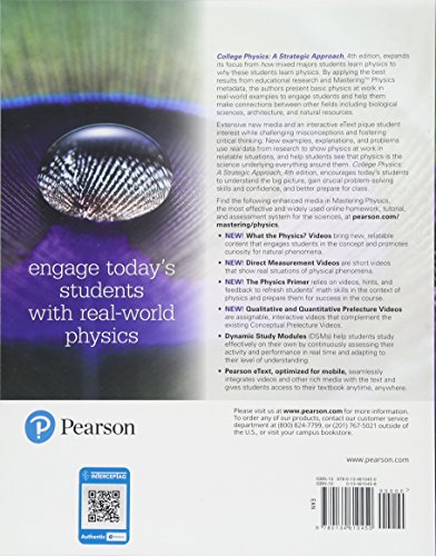College Physics: A Strategic Approach presents basic physics, using real world examples to engage you and help you connect physics with other fields such as biological sciences and architecture. From these connections, you’ll learn in research-driven ways to understand why you are taking the course and how it applies to other areas. The 4th Edition expands its focus from how you learn physics to focus on why you learn physics. Problems use real data to show physics at work and to help you see that physics is the science underlying everything around us. This print textbook is available for students to rent for their classes. The Pearson print rental program provides students with affordable access to learning materials, so they come to class ready to succeed.