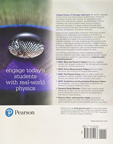 For courses in algebra-based introductory physics. Make physics relevant for today’s mixed-majors students College Physics: A Strategic Approach, Volume 2 (Chs 17-30), 4th Edition expands its focus from how mixed majors students learn physics to focusing on why these students learn physics. The authors apply the best results from educational research and MasteringTM Physics metadata to present basic physics in real world examples that engage students and connect physics with other fields, including biological sciences, architecture, and natural resources. From these connections, students not only to learn in research-driven ways but also understand why they are taking the course and how it applies to other areas. Extensive new media and an interactive Pearson eText pique student interest while challenging misconceptions and fostering critical thinking. New examples, explanations, and problems use real data from research to show physics at work in relatable situations, and help students see that physics is the science underlying everything around them. A Strategic Approach, Volume 2 (Chs 17-30), 4th Edition, encourages today’s students to understand the big picture, gain crucial problem-solving skills and come to class both prepared and confident. Also available with Mastering Physics MasteringTM is the teaching and learning platform that empowers you to reach every student. By combining trusted author content with digital tools developed to engage students and emulate the office-hour experience, Mastering personalizes learning and often improves results for each student. With Learning CatalyticsTM instructors can expand on key concepts and encourage student engagement during lecture through questions answered individually or in pairs and groups. Students also master concepts through book-specific Mastering Physics assignments, which provide hints and answer-specific feedback that build problem-solving skills. Mastering Physics now provides students with the new Physics Primer for remediation of math skills needed in the college physics course. Note: You are purchasing a standalone product; Mastering Physics does not come packaged with this content. Students, if interested in purchasing this title with Mastering Physics, ask your instructor for the correct package ISBN and Course ID. Instructors, contact your Pearson representative for more information. If you would like to purchase both the physical text CONTAINING CHAPTERS 1-30 and Mastering Physics, search for: 0134641493 / 9780134641492 College Physics: A Strategic Approach Plus Mastering Physics with Pearson eText — Access Card Package Package consists of: 0134609034 / 9780134609034 College Physics: A Strategic Approach 0134609891 / 9780134609898 Student Workbook for College Physics: A Strategic Approach 0134667042 / 9780134667041 Mastering Physics with Pearson eText — ValuePack Access Card — for College Physics: A Strategic Approach