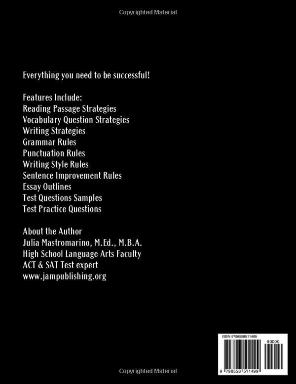 This book is a consumable workbook written for the student who is planning to take any standardized tests for reading and grammar including the Digital SAT and the ACT. The book is a student-friendly, condensed version of standardized test content designed to allow the student to gain the exact skills and knowledge and strategies required to score well in any reading, grammar, and writing test. This book includes 2 proven reading strategies to tackle Standard Assessment, ACT, and Digital SAT passages with emphasis on various question types. The book includes exact grammar, punctuation, and sentence structure knowledge to address specific language test questions as well as support stronger writing and language skills The book also contain specific vocabulary strategies to use for familiar words with multiple meanings and unfamiliar words in context. The book contains example test questions for reading and grammar sections, review questions for each new skill, and chapter-end questions for every standard. The book contains an essay outline for informative, argument essay, and literary analysis essays with instructions on how to approach and write all 3 types. Students will be able to use the book to know how to approach the reading and language sections of tests, target specific skills and knowledge, and get the most out of practice for any college-ready tests.