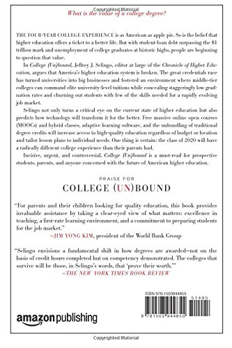 What is the value of a college degree? The four-year college experience is as American as apple pie. So is the belief that education offers a ticket to a better life. But with student-loan debt surpassing the $1 trillion mark and unemployment on the rise, people are beginning to question that value. Is a college diploma still worth pursuing at any price? In College (Un)bound, Jeffrey J. Selingo, editor at large for The Chronicle for Higher Education, argues that America’s higher education system is broken. The great credential race has turned universities into big business and fostered an environment where middle tier colleges can command elite university-level tuition while concealing staggeringly low graduation rates and churning out students with few hard skills into the job market. Selingo not only turns a critical eye to the current state of affairs in higher education, but he also predicts how technology will transform it for the better. Free massive online open courses (MOOCs) and hybrid classes, adaptive learning software, and the unbundling of traditional degree credits will increase access to high quality education regardless of budget or location and tailor lesson plans to individual needs. One thing is certain–the Class of 2020 will have a radically different college experience than their parents. Incisive, urgent, and controversial, College (Un)bound is a must-read for prospective students, parents, and anyone concerned with the future of American higher education.