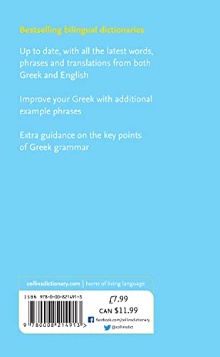 A handy and affordable quick reference guide for everyday Greek. The clear layout allows for fast and easy access when you most need it. Ideal for use on the go, at home, in the office, classroom or on holiday. Over 42,000 words and phrases and 57,000 translations. Designed for all those studying Greek who need maximum information in a handy travel format. Offers comprehensive and up-to-the-minute coverage of Greek and English, with additional notes warning the user of those words which are easily confused. Delivers the accuracy and reliability you expect from the Collins name. With natural, idiomatic example phrases, in-depth treatment of the most important core vocabulary and help to find the exact translation you want.