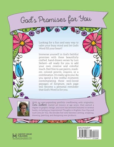 Looking for a fun and easy way to calm your busy mind and let God’s Word penetrate your heart? Immerse yourself in the Bible’s promises with these beautifully crafted, hand-drawn verses by Lori Siebert–all ready for you to add your own creative touch with paints, markers, colored pencils, or crayons. As you spend a few restful moments contemplating these well-loved passages of Scripture, each page will become a personal reminder that God’s Word is for you. You’ll enjoy filling these images with color and filling your soul with the confident assurance that God is walking with you, watching over you, and guiding you into a wonderful future.