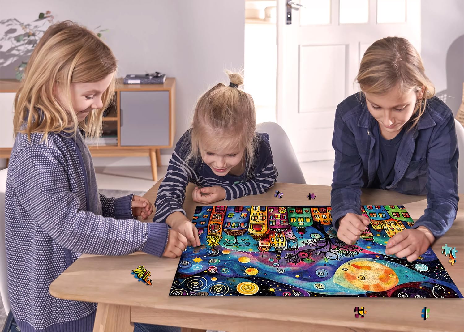 - Enchanted Nightscapes: This is a colorful fantasy city night scene puzzle, with a dark blue starry sky as the background, swirling clouds and the sun full of fantasy. The buildings are of different shapes and rich colors, with black lines outlining the details. The overall style is childlike and full of vitality