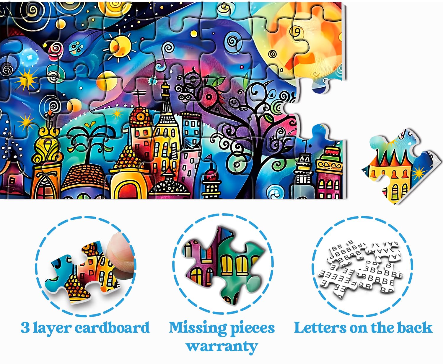 - Pemium Quality: The nature village night 1000 piece puzzle for adults made of three layers of thick white cardboard and will not deform after repeated assembly. This impossible puzzle as bright colors, a smooth surface and letters on the back of the puzzle to help you complete it