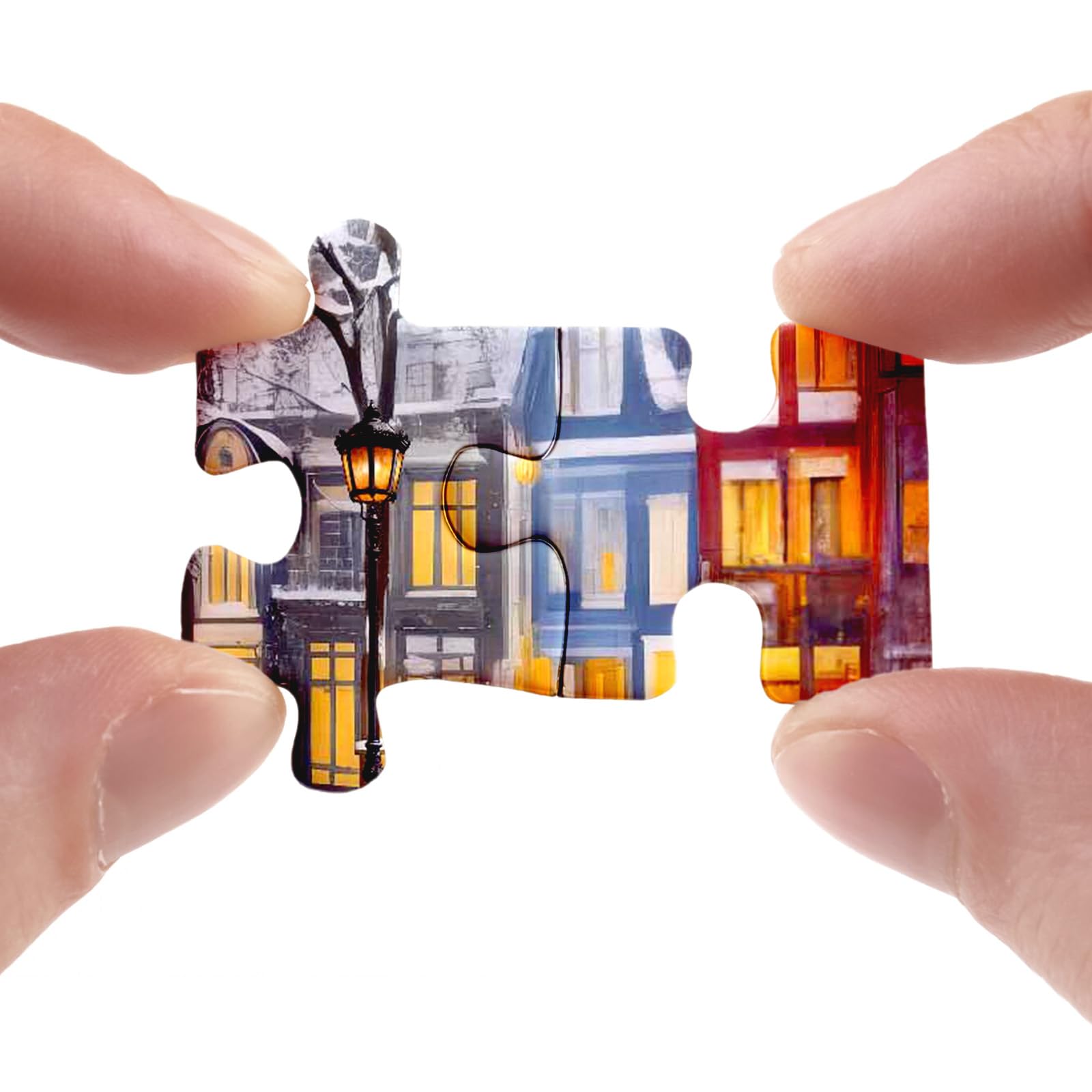 - Winter Amsterdam Puzzle: A winter scene in Amsterdam Canal, with vibrantly colored traditional Dutch buildings adorned with snow lining both sides. Several boats rest quietly on the canal, On the riverbank, people are enjoying a leisurely stroll. The sky’s purple and blue gradient hints at a peaceful sunset scene, filling the entire image with warmth and harmony