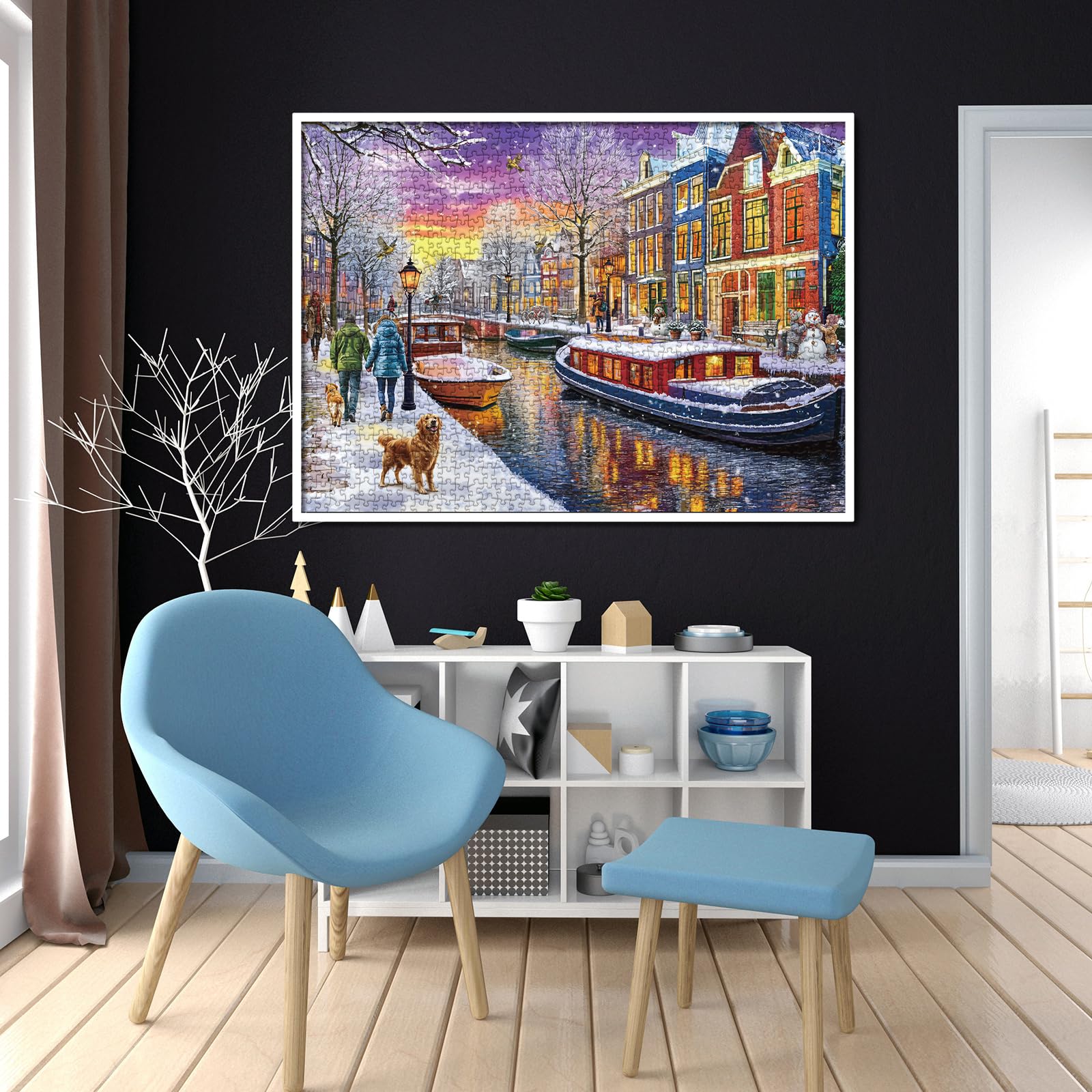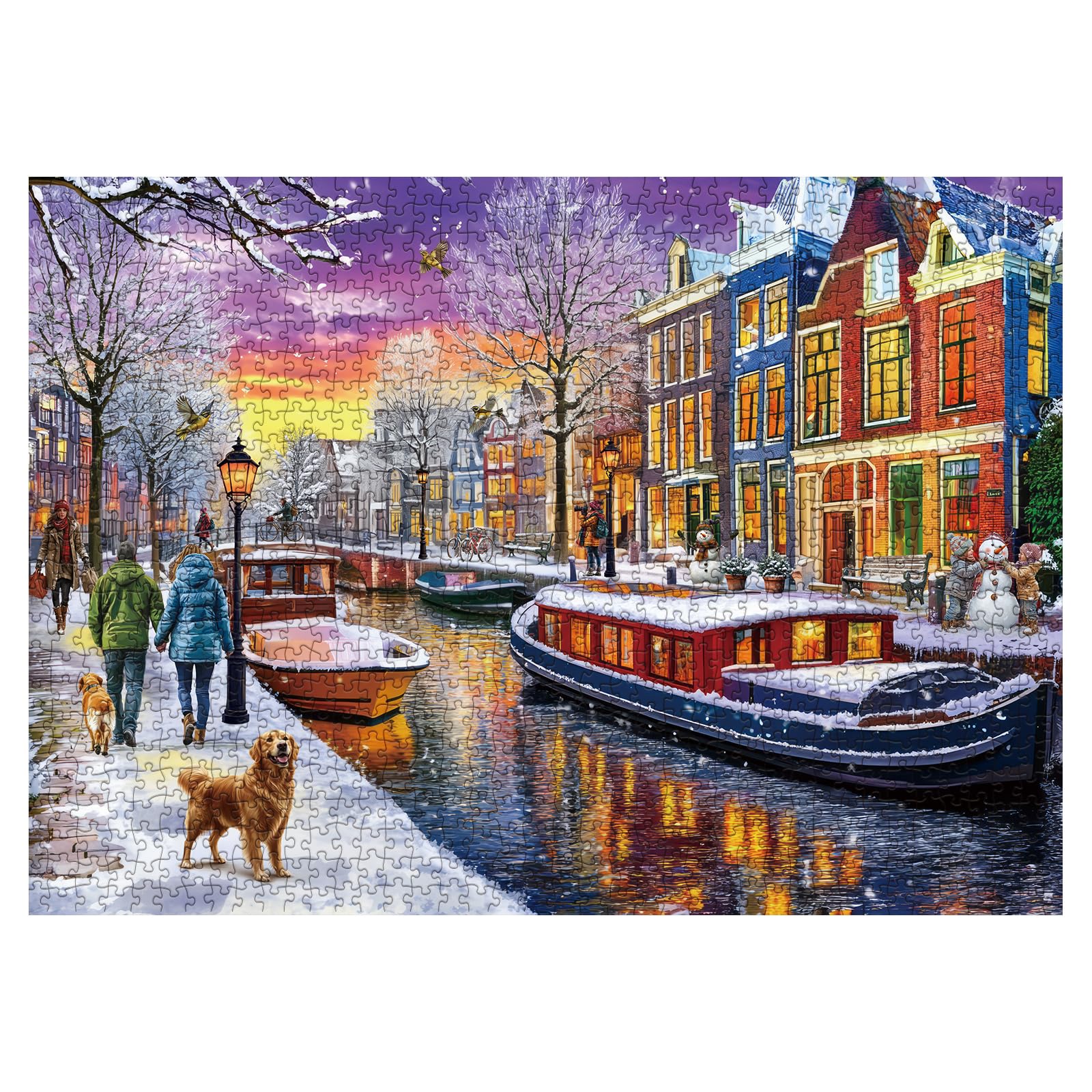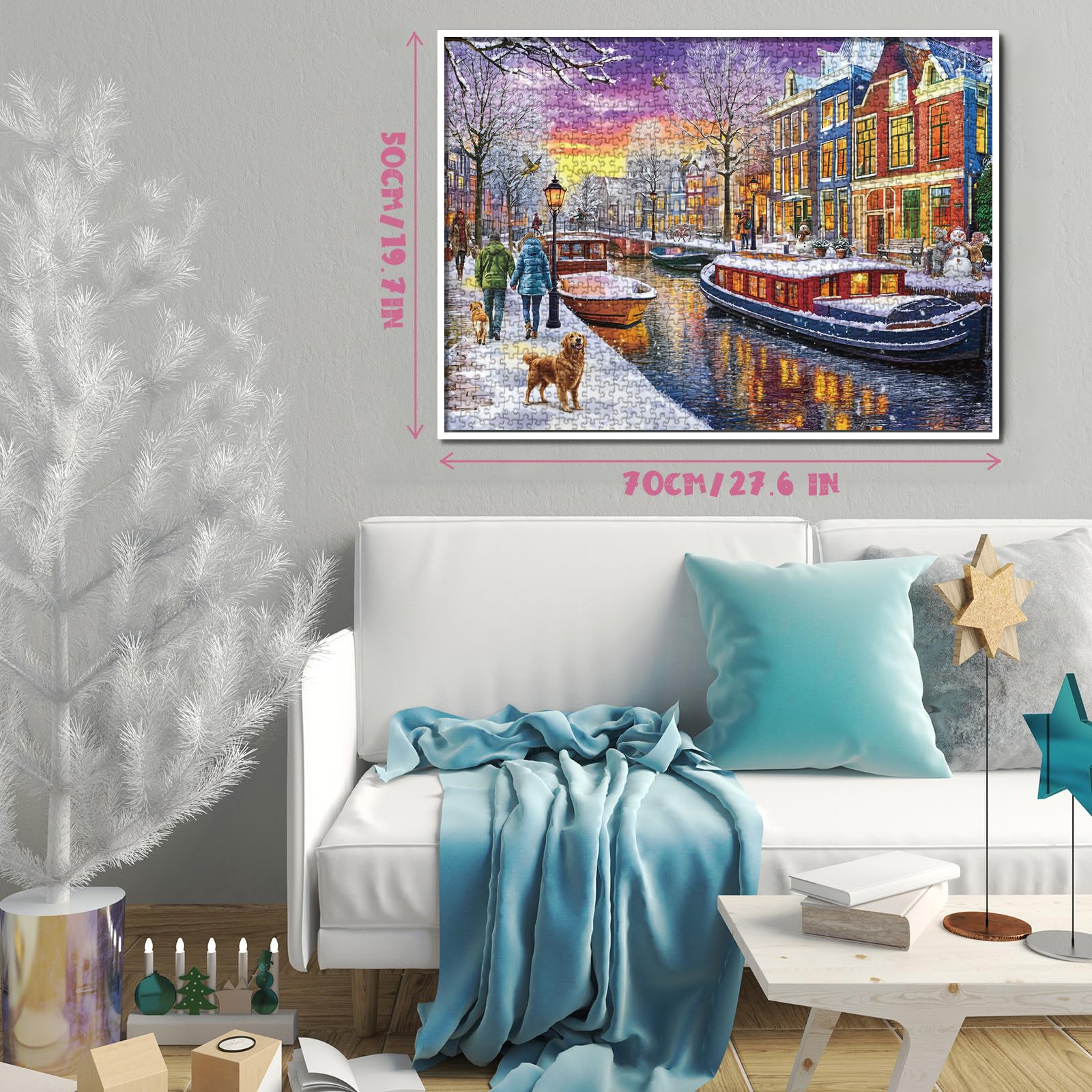 Colorful Winter Amsterdam Puzzle for Adults 1000 Pieces, Pretty Travel Landscape Jigsaw Puzzle, Dog Snowman Snow Sunset Winter Scene Puzzle