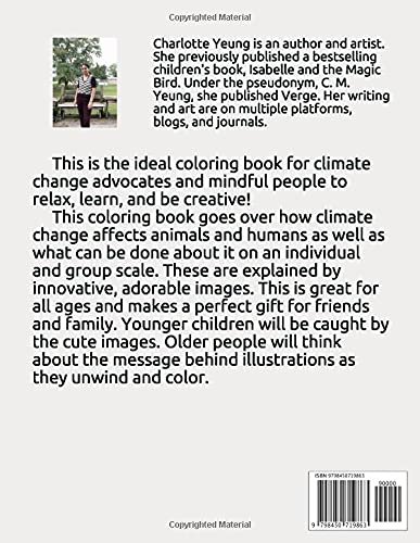 This is the ideal coloring book for climate change advocates and mindful people to relax, learn, and be creative! This coloring book goes over how climate change affects animals and humans as well as what can be done about it on an individual and group scale. These are explained by innovative, adorable images. This is great for all ages and makes a perfect gift for friends and family. Younger children will be caught by the cute images. Older people will think about the message behind illustrations as they unwind and color.