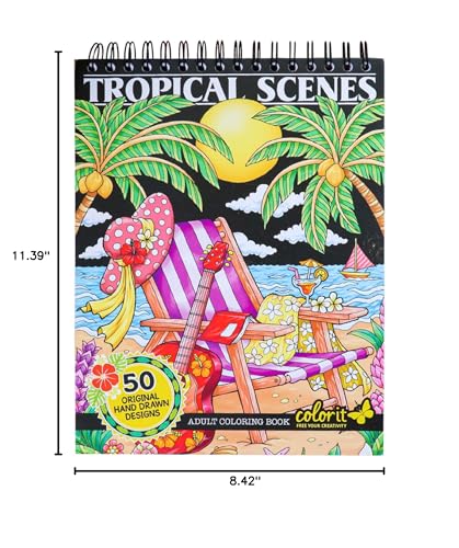 ColorIt Colorful Tropical Scenes Adult Coloring Book – 50 Single-Sided Designs, Thick Smooth Paper, Lay Flat Hardback Covers, Spiral Bound, USA Printed, Tropical Pages to Color – Teen Coloring Book