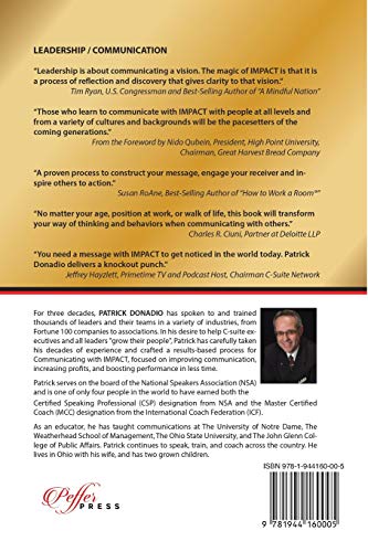 Communicating with IMPACT(c) Communication Strategies to Unlock Peak Performance and Drive Measurable Results When communication breaks down, confusion, disengagement, and mistrust take hold–crushing productivity, stifling innovation, and eroding morale. During times of change, these issues intensify, leaving your organization vulnerable to chaos. Patrick Donadio’s book, Communicating with IMPACT, will inspire and empower you to strive for a better version of yourselves and increase your IMPACT when communicating, presenting, speaking, and leading others. In an age with so much technology, communication has expanded to several platforms. Even with so many paths to communication, how do you ensure your message is received properly? Communicating with IMPACT introduces a powerful six-step framework that equips leaders and teams with actionable tools to rebuild trust, inspire action, and align efforts–turning uncertainty into opportunity and confusion into clarity. By mastering the IMPACT(c) Process, you’ll navigate the complexities of modern communication, sharpen your message, enhance engagement, and achieve lasting, measurable results. Don’t let ineffective communication derail your team’s performance and results. The IMPACT(c) Process Elevates Every Type of Communication This book is designed to help you communicate clearly and confidently in any setting: Written Communication: Emails, reports, blogs, articles, social media Interpersonal Communication: Work conversations, personal chats, sales calls, coaching sessions Group Communication: Board meetings, staff meetings, virtual meetings, presentations, training sessions, committee updates, media interviews What You’ll Learn: I: Intention – Craft a Laser-Focused Intention (LFI) statement for clarity and purpose. M: Message – Choose the best method and create compelling messages with structure, strong openings, and powerful closings. P: Person – Adapt your communication to DISC behavioral styles for stronger connections. A: Activate – Master 21 active listening skills and engagement strategies to ensure focus and involvement. C: Clarify – Apply proven techniques to confirm understanding and ensure alignment. T: Transform – Implement two types of transformation to turn communication into measurable results and achieve your Intention. Plus, assess your current communication skills with the included Communication Inventory. If you’re ready to lead with clarity, connect with purpose, and communicate for impact– Order your copy of Communicating with IMPACT(c) today and take the first step toward meaningful, lasting change for yourself and your organization.