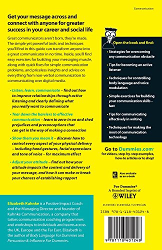 The key to perfecting your communication strategy Great communication skills can make all the difference in your personal and professional life, and expert author Elizabeth Kuhnke shares with you her top tips for successful communication in any situation. Packed with advice on active listening, building rapport with people, verbal and non-verbal communication, communicating using modern technology, and lots more, Communication Skills For Dummies is a comprehensive communication resource no professional should be without! Get ahead in the workplace Use effective communication skills to secure that new job offer Convince friends and family to support you on a new venture Utilising a core of simple skills, Communication Skills For Dummies will help you shine–in no time!