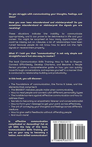 Do you struggle with communicating your thoughts, feelings, and ideas? Have you ever been misunderstood and misinterpreted? Do you sometimes misunderstand or misinterpret the signals you are receiving? These situations indicate the inability to communicate appropriately, and it can prove to be detrimental in life and your career. You might be surprised at how many opportunities you could be missing out on. Likewise, a lot of relationships have been ruined because people do not know how to send out the right signals or receive them properly. What if I told you that “communicating” is not only simple and straightforward but also easy to master? However, with so many false information taught by the “gurus,” it is sometimes hard to cut through the noise. That’s where this book comes in. This book will give you everything you need to become a better and more effective communicator. The book Communication Skills Training: How to Talk to Anyone, Connect Effortlessly, Develop Charisma, and Become a People Person provides a comprehensive guide on how you can quickly move through conversations, and express yourself in a manner that is conducive to relationship-building and productivity. In this book, you will discover: The foundations of communication, the forms it takes, and the elements that comprise it The BIGGEST mistakes people make when communicating How to read people and connect with different personality types The invisible barriers against effective communication and how to address them Secrets to becoming an empathetic listener and conversationalist How to Form your message to get your point across effectively The art of conveying your thoughts and feelings across different mediums How to give useful feedbacks without offending people And MUCH more tips on improving your communication skills! The best types of communication are those that are simple and easy to understand. As such, this book aims to provide you with the information you need in a format that is non-demanding, easy to digest, and even easier to apply. To help you get the hang of the concepts of the book, it provides many real-life scenarios and actual events wherein the principles contained within are easily applied and yield the best possible results for people in a conversation. Is effective communication complicated or demanding? Not at all! With the help of this book, Communication Skills Training, you are on your way to becoming a better, more skilled communicator! Scroll up, click “Buy Now,” and master the art of smart and effective communication!