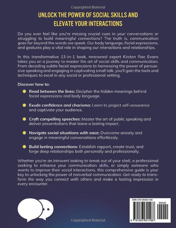 Unlock the Power of Effective Communication and Transform Your Social Interactions with Social Skills [13-in-1] As an ambitious person, you understand the importance of strong social skills in achieving success both personally and professionally. But navigating the complex world of social interactions and mastering the art of effective communication can often be a struggle. Perhaps you are familiar with these situations: You enter a networking event and notice how your mind goes blank when trying to initiate conversations. During a presentation, you try to convey complex ideas, but your audience seems disengaged and unconvinced. You consistently miss nonverbal cues in social interactions, leading to misunderstandings and awkward moments. You find yourself overthinking every social interaction and doubting your ability to connect with others. You realize that your lack of confidence is holding you back from building meaningful relationships and seizing opportunities. Sure, you can blame your introversion, past experiences, or lack of natural charisma. But in the long run, poor social skills can lead to missed opportunities, unfulfilling relationships, and a sense of isolation. Effective communication and strong social skills are not innate characteristics – they can be learned and mastered by anyone. And with the right guidance and practice, you can transform the way you interact with others. In this transformative book, Kirsten Rae Evans reveals the secrets to unlocking the power of effective communication. Here’s a glimpse of the invaluable insights you’ll gain from this 13-in-1 book: Public Speaking: The Power Within: Develop unshakable self-esteem and resilience in the face of social challenges and setbacks. Magnetic Charm: Harness the power of charisma to captivate others and leave a lasting impression wherever you go. The Art of Words: Become a master storyteller and use the power of narrative to captivate, inspire, and influence others. Speak Up and Slay: Unleash your inner confidence and overcome public speaking anxiety to deliver powerful presentations. The Persuasive Speaker: Craft compelling speeches and master the art of persuasion to win over any audience Body Language: Reading Between the Lines: Master the art of nonverbal communication by deciphering facial expressions, gestures, and postures. Gestures and Postures: Develop a keen awareness of your own body language to project confidence and competence. Human Actions and Emotions: Decode the hidden meanings behind human actions and emotions to respond effectively. Small Talk: Starting Meaningful Conversations: Effortlessly initiate conversations and never run out of things to say. Psychology of Initial Encounters: Navigate the complexities of initial encounters and make stellar first impressions. Lasting Connections Through Rapport: Build instant rapport and cultivate deep, meaningful connections. Building Meaningful Connections: Transform small talk into engaging, purposeful conversations that foster genuine connections. Whether you’re an introvert seeking to break out of your shell, a professional looking to enhance your communication skills, or simply someone who wants to improve their social interactions, “Social Skills [13-in-1]” is your ultimate guide to becoming a master communicator! What are you waiting for? Get your copy today and unlock the door to a world of endless social possibilities!