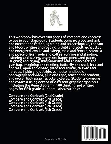 This workbook has over 100 pages of compare and contrast to use in your classroom. Students compare a boy and girl, and mother and father, lightning and an earthquake, the Sun and Moon, writing and reading, a child and adult, exhausted and energized, awake and asleep, male and female, scientist and police officer, soda and coffee, running and standing, listening and talking, angry and happy, pencil and paper, laughing and crying, sharpener and eraser, backpack and gym bag, imagining and reading, butterfly and snail, free and not free, open and closed, plant and animal, relaxed and nervous, inside and outside, computer and book, photograph and video, glue and tape, teacher and student, and more. Each page has cute pictures. Students compare and contrast using dozens of different graphic organizers (including the Venn diagram). 100 thinking and writing pages for fifth-grade students. Also available: Compare and Contrast (2nd Grade) Compare and Contrast (3rd Grade) Compare and Contrast (4th Grade) Compare and Contrast (5th Grade) Compare and Contrast (6th Grade)