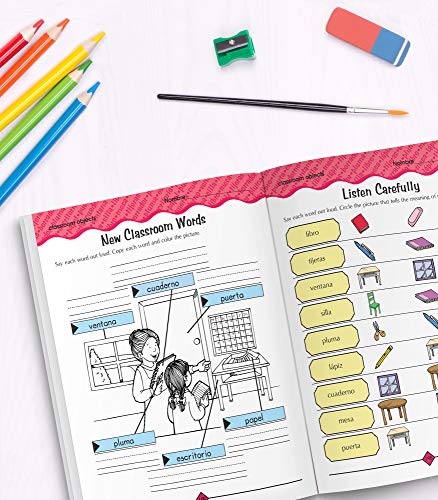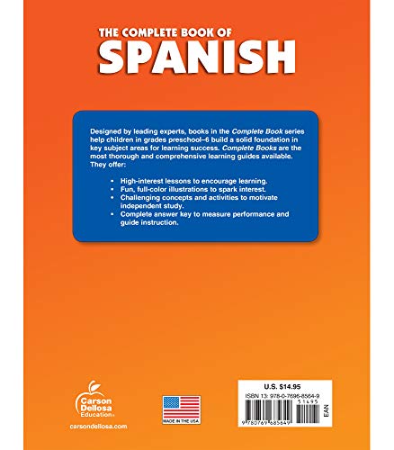 Workbook Features: * Ages 6-9, Grades 1-3 * 352 pages, 10 1/2 inches x 8 inches * Topics covered: Spanish alphabet, expressions, parts of speech, culture, and more * Includes a poster and motivational stickers * Answer key, learning cards, and glossary included Focused Practice: Carson Dellosa’s Complete Book of Spanish Workbook helps first through third grade Spanish learning students build Spanish fluency in reading, writing, and speaking through engaging activities and lessons. What’s Included: The Spanish for kids workbook includes a colorful poster and motivational stickers to encourage students on a job well done. The book also includes hands-on activities, reviews, learning cards, songs, a glossary, and an answer key. How It Works: This 1st-3rd grade workbook features lessons and engaging activities to help students learn vocabulary, common phrases, pronunciation, and more. Students also learn about cultural foods, songs, celebrations, and more. Working Together: Parents love using the workbook for added practice from home, and teachers love to incorporate it into hands-on Spanish lessons. Use the learning cards for additional practice and track student progress with the answer key. Why Carson Dellosa: For more than 40 years, Carson Dellosa has provided solutions for parents and teachers to help their children get ahead and exceed learning goals. Carson Dellosa supports your child’s educational journey every step of the way.