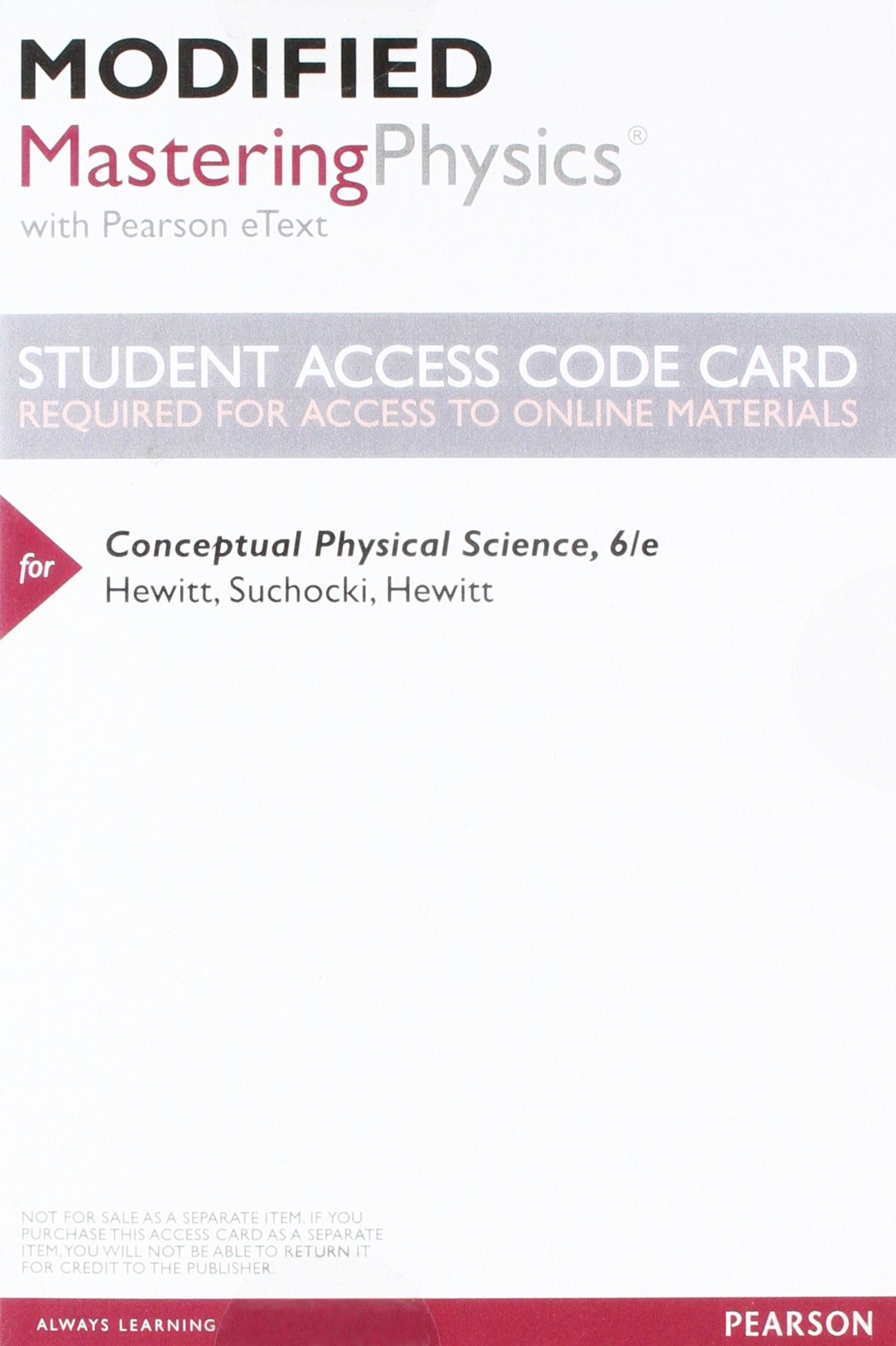 ALERT: Before you purchase, check with your instructor or review your course syllabus to ensure that you select the correct ISBN. Several versions of Pearson’s MyLab & Mastering products exist for each title, including customized versions for individual schools, and registrations are not transferable. In addition, you may need a CourseID, provided by your instructor, to register for and use Pearson’s MyLab & Mastering products. NOTE: Make sure to use the dashes shown on the Access Card Code when entering the code. Student can use the URL and phone number below to help answer their questions: http://247pearsoned.custhelp.com/app/home 800-677-6337 Packages Access codes for Pearson’s MyLab & Mastering products may not be included when purchasing or renting from companies other than Pearson; check with the seller before completing your purchase. Used or rental books If you rent or purchase a used book with an access code, the access code may have been redeemed previously and you may have to purchase a new access code. 0134466926 / 9780134466927 Conceptual Physical Science, Books a la Carte Edition; Modified MasteringPhysics with Pearson eText — ValuePack Access Card — for Conceptual Physical Science, 6/e Package consists of: 013408229X / 9780134082295 Conceptual Physical Science, Books a la Carte Edition, 6/e 0134092260 / 9780134092263 Modified MasteringPhysics with Pearson eText — ValuePack Access Card — for Conceptual Physical Science, 6/e