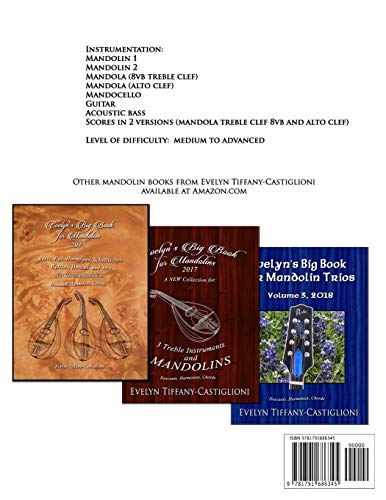 This collection includes all four concert pieces for mandolin ensemble that Evelyn Tiffany-Castiglioni (author of Evelyn’s Big Books for Mandolin ensemble) has composed to date. They have been performed by the Marilynn Mair’s ensemble Enigmatica, the Austin Mandolin Orchestra, the Tahlequah Mandophonics (Tahlequah, Oklahoma), the New York Mandolin Orchestra, and l’Esperance Mandolin Ensemble (Providence, RI).Instrumentation is mandolin 1, mandolin 2, mandola (scores in 8vb treble clef as well as in alto clef), mandocello, guitar, and bass. Scores are provided in two formats: with mandola in 8vb treble clef and in alto clef.