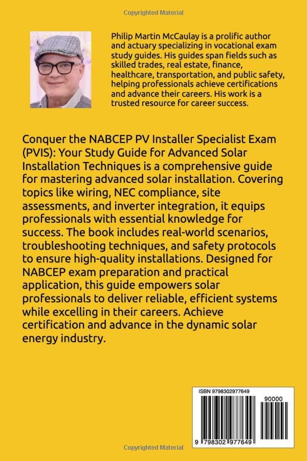 Conquer the NABCEP PV Installer Specialist Exam (PVIS): Your Study Guide for Advanced Solar Installation Techniques is the ultimate resource for professionals preparing to excel in the solar industry. Designed for individuals seeking NABCEP certification, this guide offers comprehensive insights into advanced photovoltaic system installation practices. Starting with a thorough overview of photovoltaic systems, the guide delves into critical components like panels, inverters, and wiring configurations. It provides in-depth knowledge about site assessments, shading analysis, and mounting techniques tailored for various environments. Special attention is given to advanced electrical configurations, ensuring compliance with NEC standards and optimal system performance. Safety is a central theme, with detailed protocols for OSHA standards and rapid shutdown systems. The book also covers battery integration for hybrid and off-grid systems, troubleshooting common installation challenges, and strategies for ensuring system longevity. Real-world scenarios and practice questions enable readers to apply theoretical knowledge to practical challenges. Beyond exam preparation, this guide emphasizes customer communication and effective project management to build trust and ensure satisfaction. Packed with actionable strategies, technical knowledge, and industry best practices, it is an indispensable tool for solar professionals looking to advance their careers. Master the skills needed to deliver safe, efficient, and reliable solar installations while achieving success in the NABCEP PV Installer Specialist Exam.