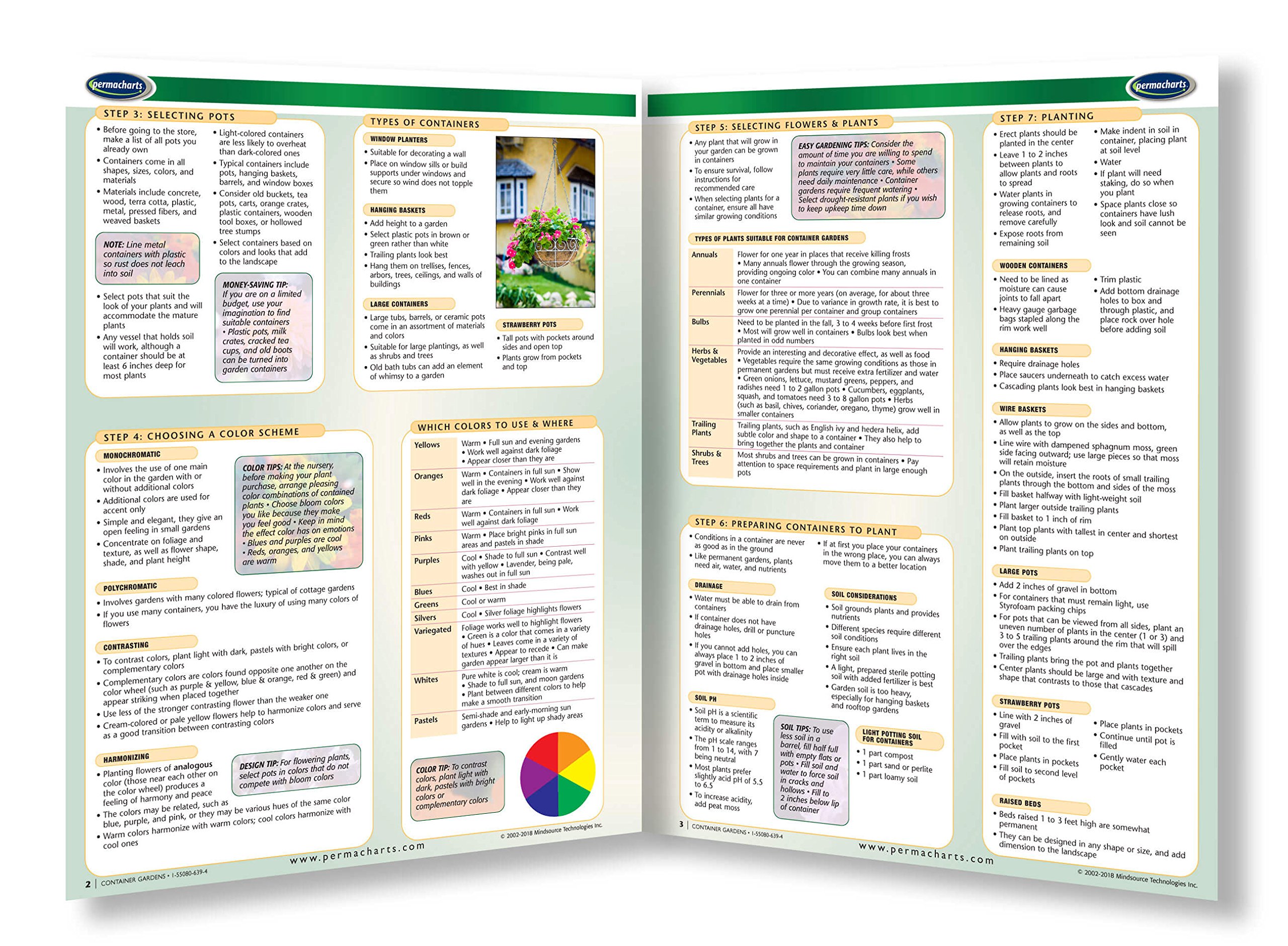 A great well-designed garden can come in any size. This 4-page laminated quick reference Guide provides excellent support to gardeners who have dreams of beauty in a small space. This Guide provides specific assistance to anyone who seeks the beauty of a lovely garden in a small space. Container gardens for use on patios, decks, balconies, and rooftops settings are all concisely described. This Guide places special emphasis on color choices and plant selection.