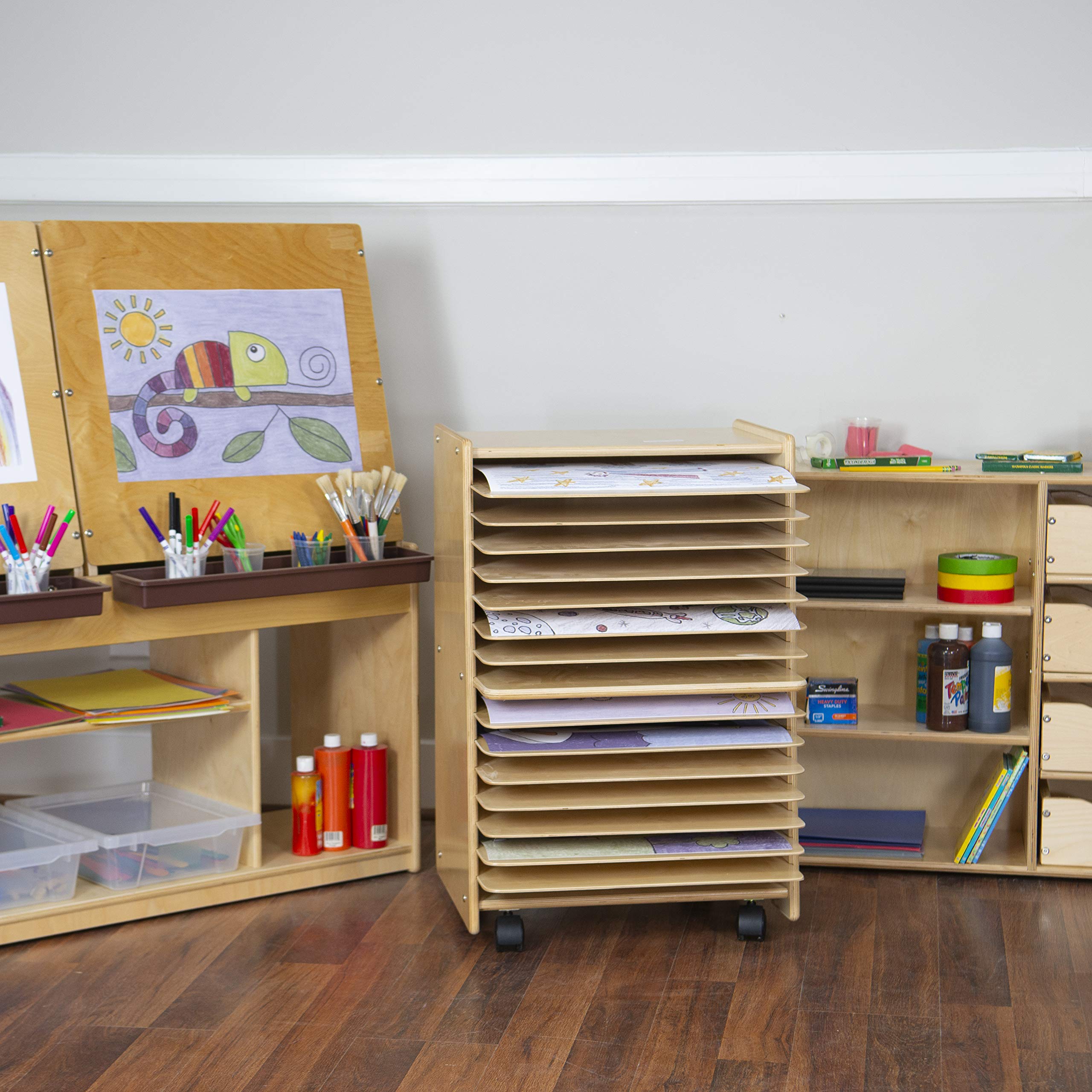 This mobile rack provides organized storage for student art projects, helping to keep the learning space tidy and functional.