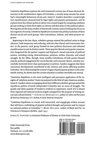 Contentious Republicans explores the mid-nineteenth-century rise of mass electoral democracy in the southwestern region of Colombia, a country many assume has never had a meaningful democracy of any sort. James E. Sanders describes a surprisingly rich republicanism characterized by legal rights and popular participation, and he explains how this vibrant political culture was created largely by competing subaltern groups seeking to claim their rights as citizens and their place in the political sphere. Moving beyond the many studies of nineteenth-century nation building that focus on one segment of society, Contentious Republicans examines the political activism of three distinct social and racial groups: Afro-Colombians, Indians, and white peasant migrants. Beginning in the late 1840s, subaltern groups entered the political arena to forge alliances, both temporary and enduring, with the elite Liberal and Conservative Parties. In the process, each group formed its own political discourses and reframed republicanism to suit its distinct needs. These popular liberals and popular conservatives bargained for the parties’ support and deployed a broad repertoire of political actions, including voting, demonstrations, petitions, strikes, boycotts, and armed struggle. By the 1880s, though, many wealthy Colombians of both parties blamed popular political engagement for social disorder and economic failure, and they successfully restricted lower-class participation in politics. Sanders suggests that these reactionary developments contributed to the violence and unrest afflicting modern Colombia. Yet in illuminating the country’s legacy of participatory politics in the nineteenth century, he shows that the current situation is neither inevitable nor eternal.