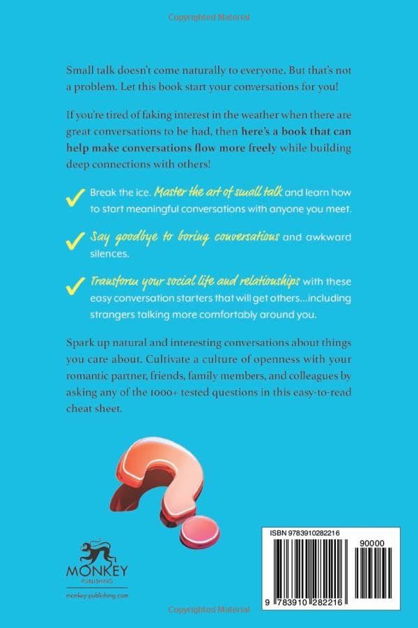 Have you ever been in a social space where the silence seems to stretch longer than infinity because everyone is waiting for ‘someone’ to break the ice? Do you maybe find it a little difficult connecting with others because you are never sure about the right things to say to them…including your loved ones? Diane Weston dispenses over 1000 cheat sheet questions in this easy-to-use conversation starter book to help anyone looking to lead awe-inspiring conversations, or spark deeper connections with others, get off on a great start by asking all the right questions that are sure to get you and others talking. Who is This Book For: People who would like to have deeper conversations People who want to get to know their loved ones better, and build long-lasting relationships with them. Anyone desiring to increase their social circle. If you are tired of faking interest in the weather when there are great conversations to be had, then this book is for you! What You Will Find in This Book: A collection of over 1,000 captivating questions covering a wide range of topics that have been grouped into sections of 10, in order of complexity, from random everyday questions to more in-depth, personal questions that can help make conversations flow more freely for you while building deep connections with others! Break the ice. Master the art of small talk and learn how to start meaningful conversations with anyone you meet. Say goodbye to boring conversations and awkward silences. Make a killer first impression on people. Transform your social life and relationships with these easy conversation starters that will get others…including strangers, talking more comfortably around you. How You Can Use This Book: 1. Get to know yourself better! Spend some quality time discovering parts of yourself you did not know about. Have fun answering deep and personal questions by yourself, and overcome the fear of communicating your emotions to others by practicing answering the questions in this cheat sheet book. Boost your confidence. Explore topics about life, to talk about, and become a great conversationalist. 2. One-on-One Conversations No one wants to be stuck in the same room with a boring person. Ask all the right questions that set great conversations in motion. Spark up natural and meaningful conversations about things you care about with anyone, anytime and anywhere. Cultivate a culture of openness with your romantic partner, parent, friend, child, or colleague. Take turns asking and answering questions to spice up your relationship. Learn how to communicate effectively with everyone, and bridge the gaps in your relationships by asking the right questions. 3. Group Gatherings Be yourself at family gatherings, date nights, and social events without running out of things to say. Inspire unforgettable conversations with family, friends, or colleagues at group gatherings. Lead every discussion with confidence, style, and mastery. Build and sustain strong connections with others. Create special memories by taking turns asking funny, weird, and personal questions. Strengthen your relationships with loved ones and discover new things about them. Knowing the right questions to ask might just be the only tool you need to discover new possibilities about yourself and others. Don’t let your conversations fall flat. Take the first step in learning how to become an expert conversationalist. Simply scroll up and click on “BUY NOW” to grab a copy and start connecting with people today!