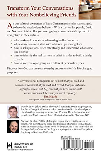 Witnessing used to involve laying out the truth and guiding a person to understand and accept it. But the awareness of basic Christian principles has changed and so have the needs of pre-believers. With a passion for people, authors David and Norman Geisler share an engaging, conversational approach to evangelism as they address: What makes old models of witnessing ineffective in today’s culture Why evangelism must start with relational pre-evangelism How to ask questions, listen attentively, and understand what someone believes Ways to identify the real barriers to belief in order to build a bridge to truth How to keep dialogue going with different personality types This refreshing, practical resource is ideal for churches and individuals. Readers will discover how God uses their everyday encounters for great things when they switch from trying to witness effectively to effectively being a witness through communication and compassion.