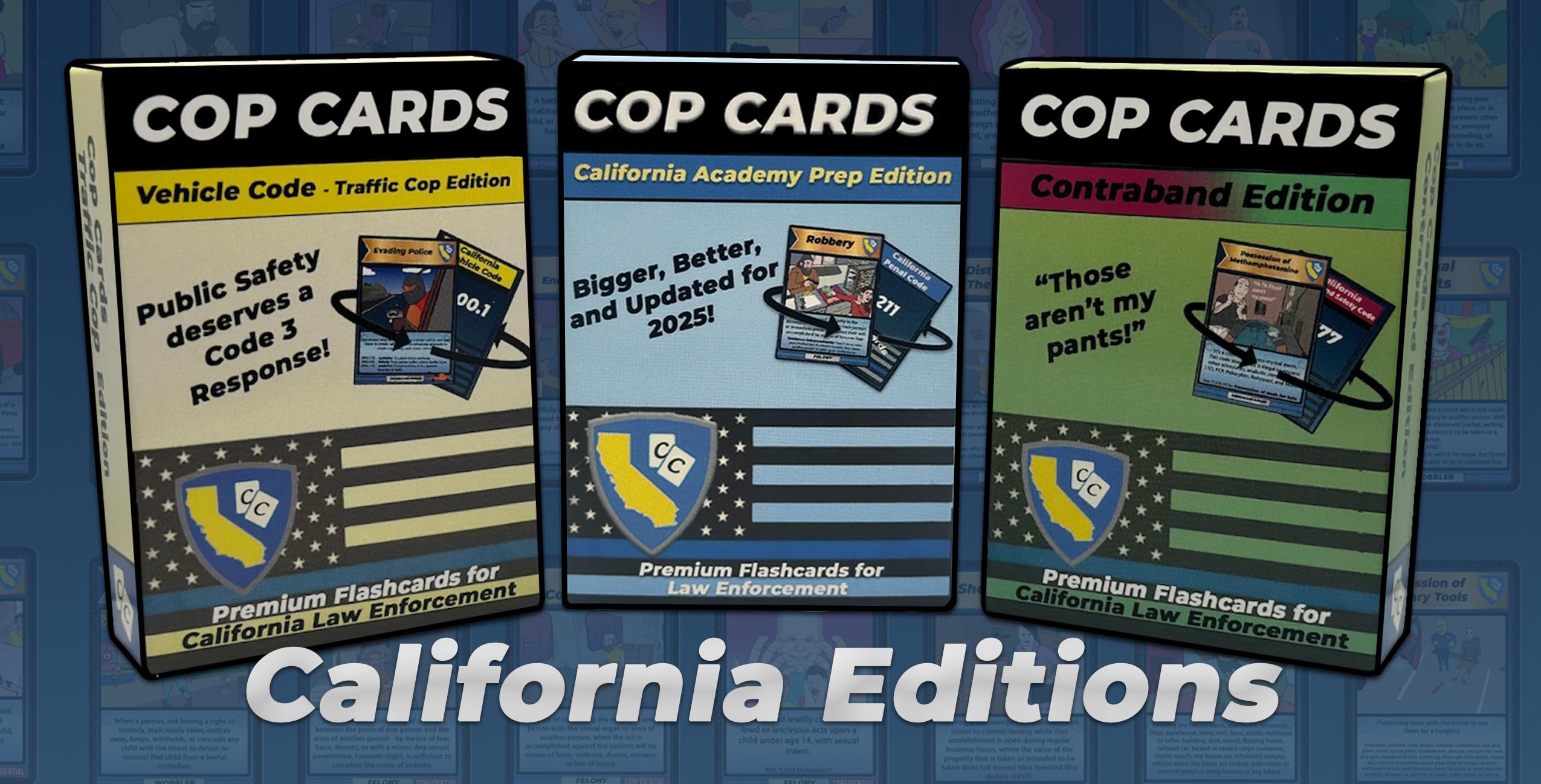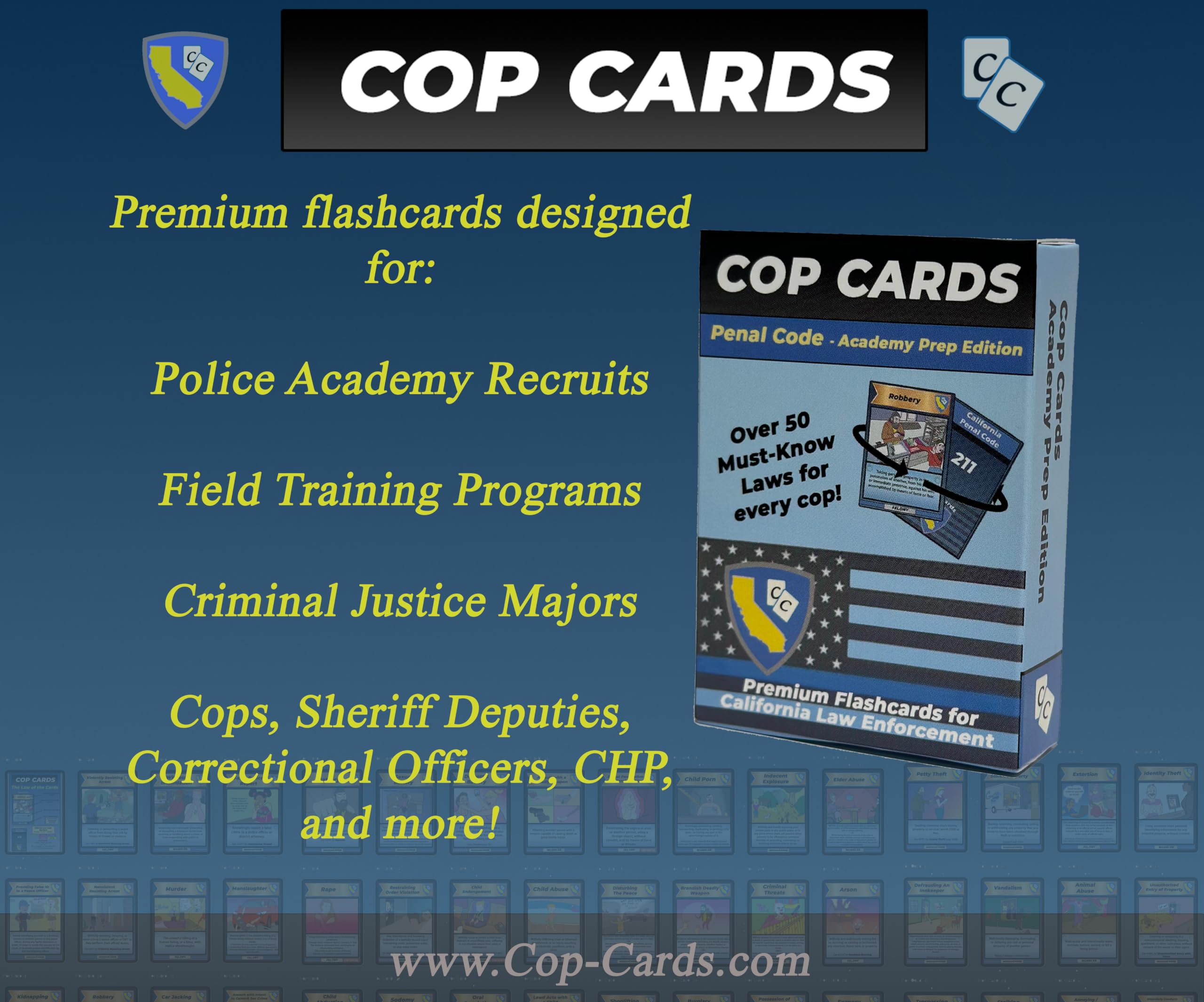 Cop Cards: California Academy Prep Editionis a set of quality, up-to-date flashcards designed to be studied by anyone who needs to know basic California Penal Codes. They’re designed by a current police sergeant, field training officer, and police academy staff member right here in California. And while they aren’t a substitute for state-certified training, they also aren’t your typical, handmade pile of 3×5″s that take countless hours to create and end up a crumpled mess in the trash can. These are beautifully fashioned from the same material as traditional trading cards, make an excellent gift or training aid, and can be used in both an academy and field environment.