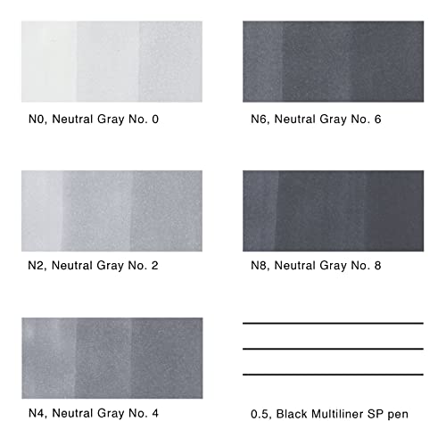 - This 6 piece Sketching Grays set includes a combination of neutral gray colors N0, N2, N4, N6, N8, and a black 0.5 Multiliner SP pen. This set is perfect for sketching, designing, and illustrating.